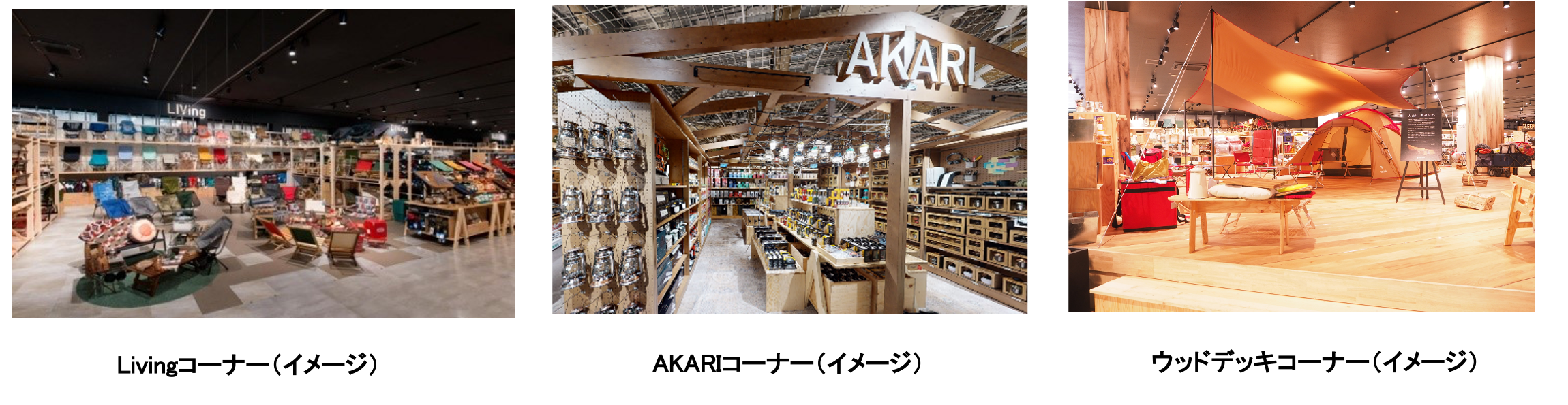従来の「LIVing」、「DINing」、「SLEEPing」コーナーに加え、オイルランタンやキャンドルランタンの品揃えを拡充した「AKARI」コーナーなど、多様なテーマに沿った商品陳列となっており、リアルなシーンを楽しくイメージしやすい店内となっております。