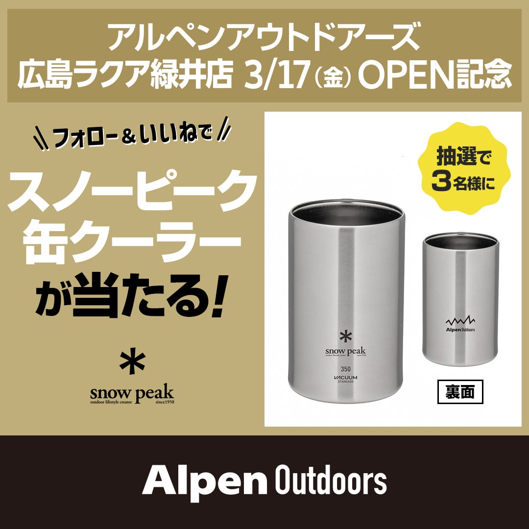 内容 :アルペンアウトドアーズ広島ラクア緑井店のオープンを記念して、「いいね&フォロー」で「スノーピーク 缶クーラー350(Alpen Outdoors限定販売モデル)」を3名様にプレゼント!