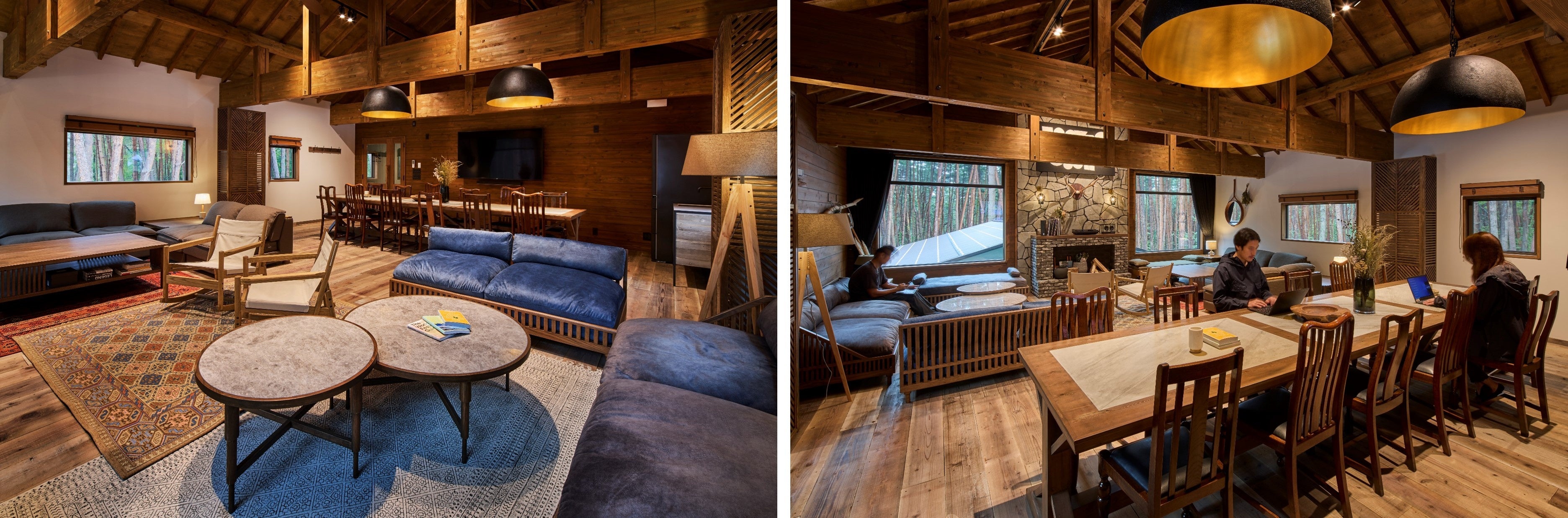 キャンプ場を中心としたアウトドア複合施設「FOLKWOOD VILLAGE 八ヶ岳(フォークウッド ビレッジ ヤツガタケ)」内のメイン棟2階フロアを、リアルゲイトが企画・インテリアデザインを行い、昨年秋にオープンしたキャンプサイト付きワーケーション施設。