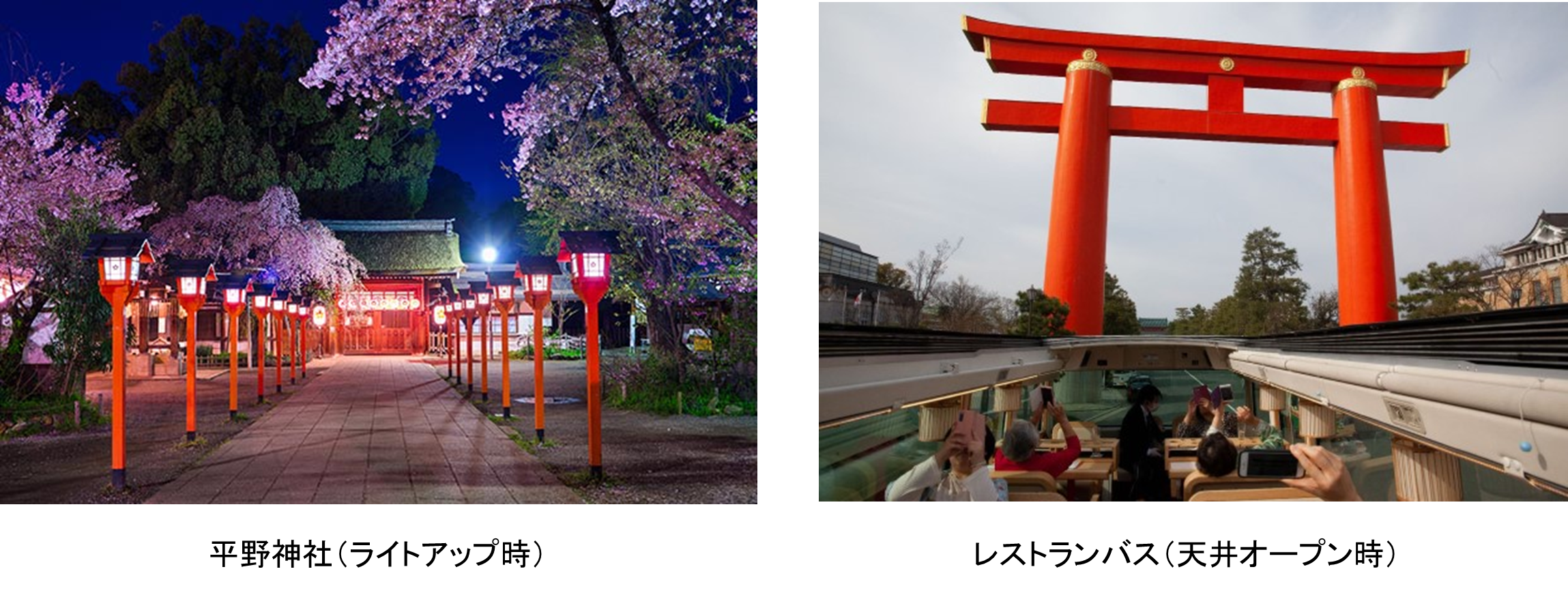 走行ルートは、京都駅を出発し、車窓からお楽しみいただける京都の桜の名所として知られる「川端通り」「冷泉通り」「堀川通り」をはじめ、自由散策時間を設けている「疎水の桜」や60種類400本の桜が咲き誇る「平野神社」など、観光名所に加え京都の桜スポットを巡ります。いつもとは違うレストランバス車内の高さ約3mの目線から眺める景色が、春の訪れを感じられる特別な時間へとお連れします。