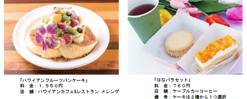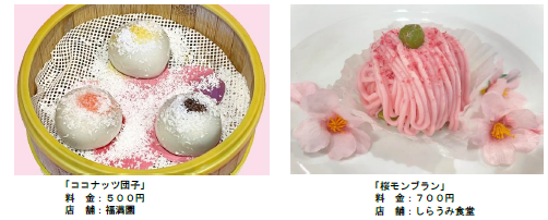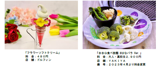 『#はなパラ』の期間中、島内のレストランや軽飲食店舗では、花のフードメニューをご用意いたします。食用花であるエディブルフラワーを使用した「フラワーソフトクリーム」や、桜の花びらを表現した「桜モンブラン」など、味覚だけでなく視覚でもお花見シーズンを盛りあげます。