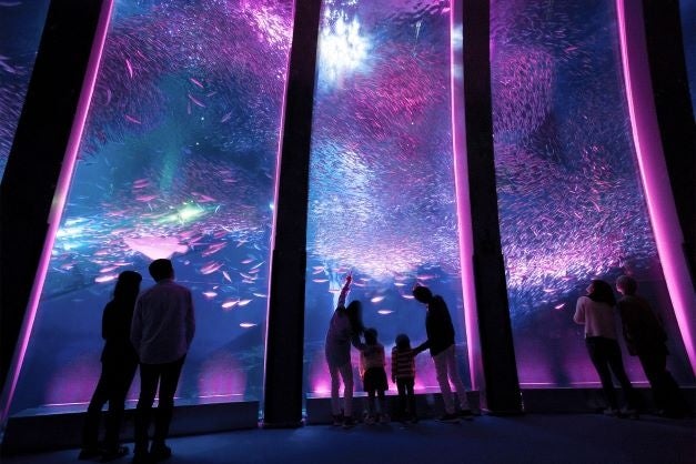 水族館「アクアミュージアム」にある高さ8m、水量1,500トンの大水槽「大海原に生きる群れと輝きの魚たち」では、国内最多飼育数の5万尾のイワシが音楽や照明に合わせ乱舞する「スーパーイワシイリュージョン ~桜花乱舞~」を期間中、毎日開催しております。