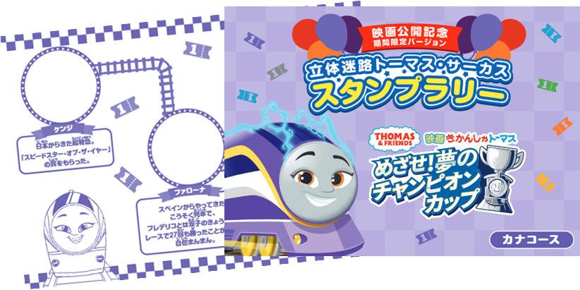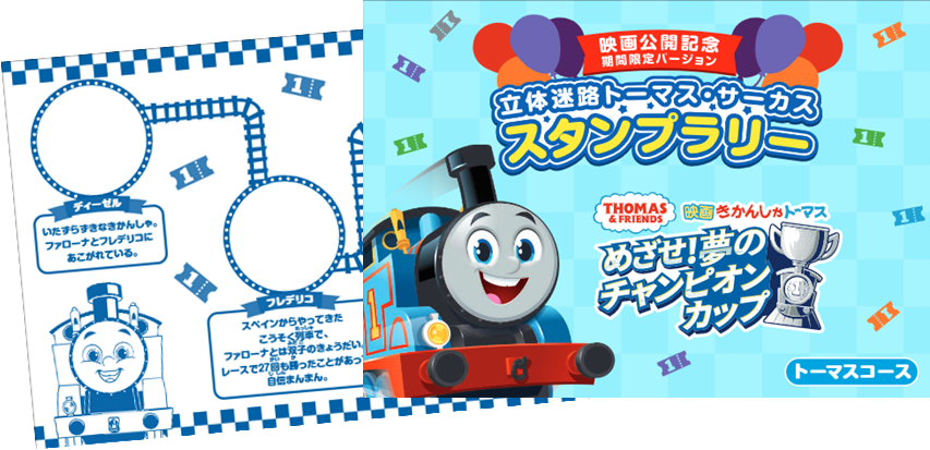「映画きかんしゃトーマス めざせ!夢のチャンピオンカップ」の公開を記念して、立体迷路トーマス・サーカスが期間限定で映画バージョンに切り替わります。トーマスコースとカナコースに分かれ、迷路の中にあるスタンプを全て集めると、オリジナルペーパークラフトをプレゼントいたします。