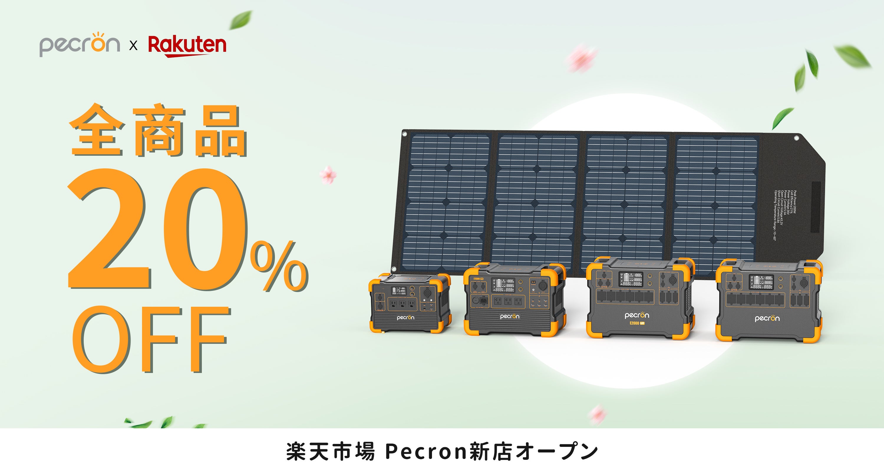 この度、Pecronは、オンラインショップ「Pecron楽天市場店」を楽天市場にオープン致しました。ポータブル電源とソーラーパネルなどを取り扱います、店舗全商品を20%OFFで購入できるオープン記念セールも同時に開催しますので、ぜひご利用ください。