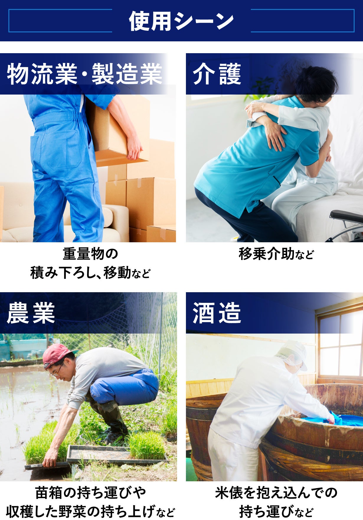 人の手が必要な労働現場は未だに数多く、特に肉体を駆使する労働現場は3K(きつい・汚い・危険)と言われるほど肉体的にも精神的にも負担が大きく離職率の高さが問題となっています。離職に繋がる原因の中で多いのが「腰を痛める」など運動器のトラブルが発生し「仕事が続けられない」というケース。この問題を解決することを目的に、当社では様々なアシストスーツの開発に注力しています。