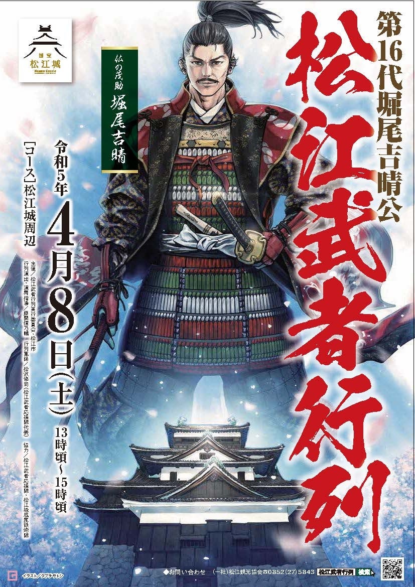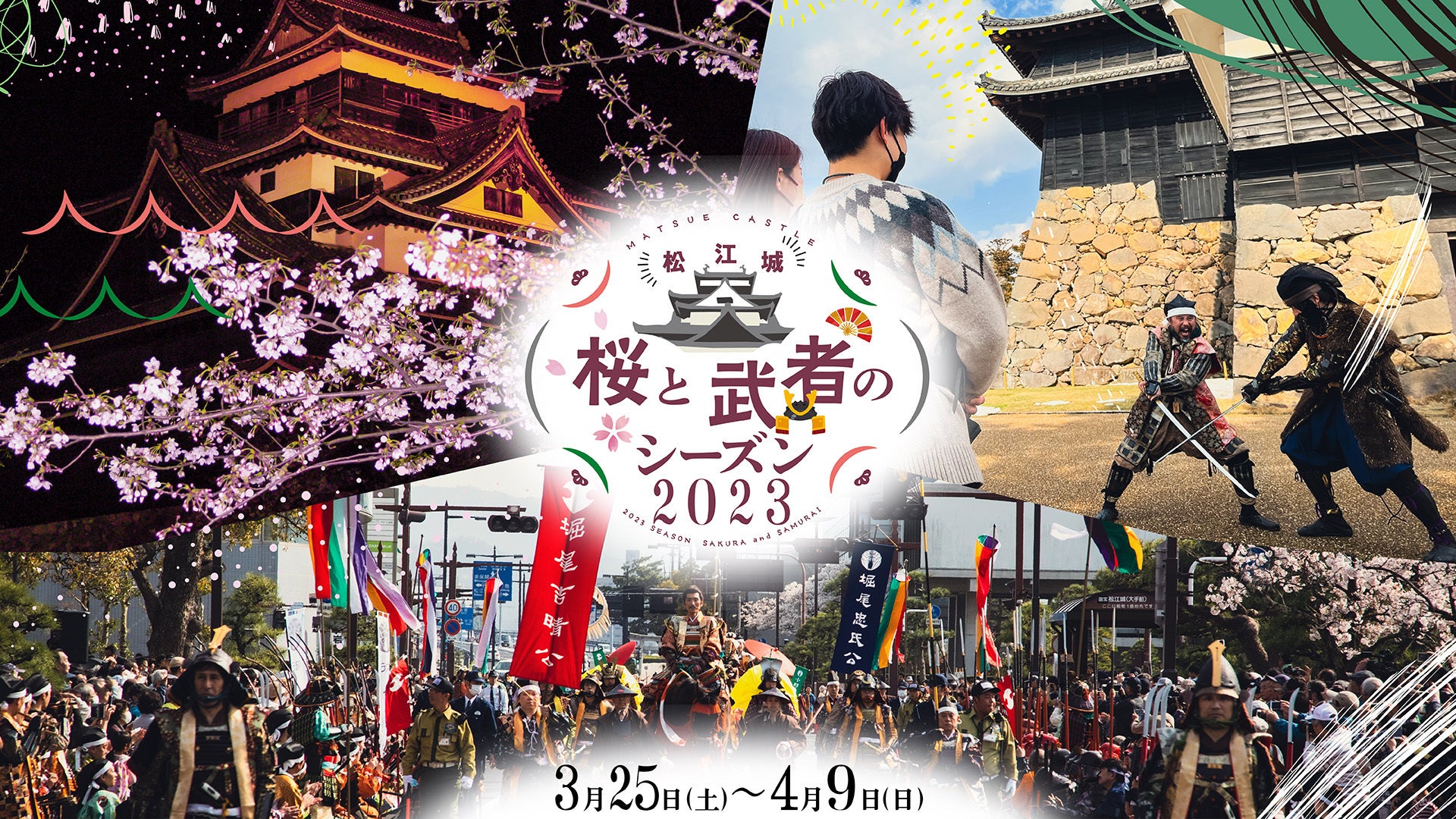 この春の「松江城 桜と武者のシーズン2023 」は、 2023年3月25日(土)~4月9日(日)の期間で開催される「国宝松江城・お城まつり 」、4年ぶりの開催となる 「第16代堀尾吉晴公・松江武者行列 」、そして今年初開催となる、武者行列のスピンオフ企画 「城中いきなり時代劇 」など、春の観光を楽しむイベントが盛りだくさんとなっております。松江城をはじめとする美しい風景や、癒しの空間、そして勇壮な武者との出会いなど、「松江城 桜と武者のシーズン2023」を通して、松江で春の観光の魅力を存分にお楽しみいただければと思っております。