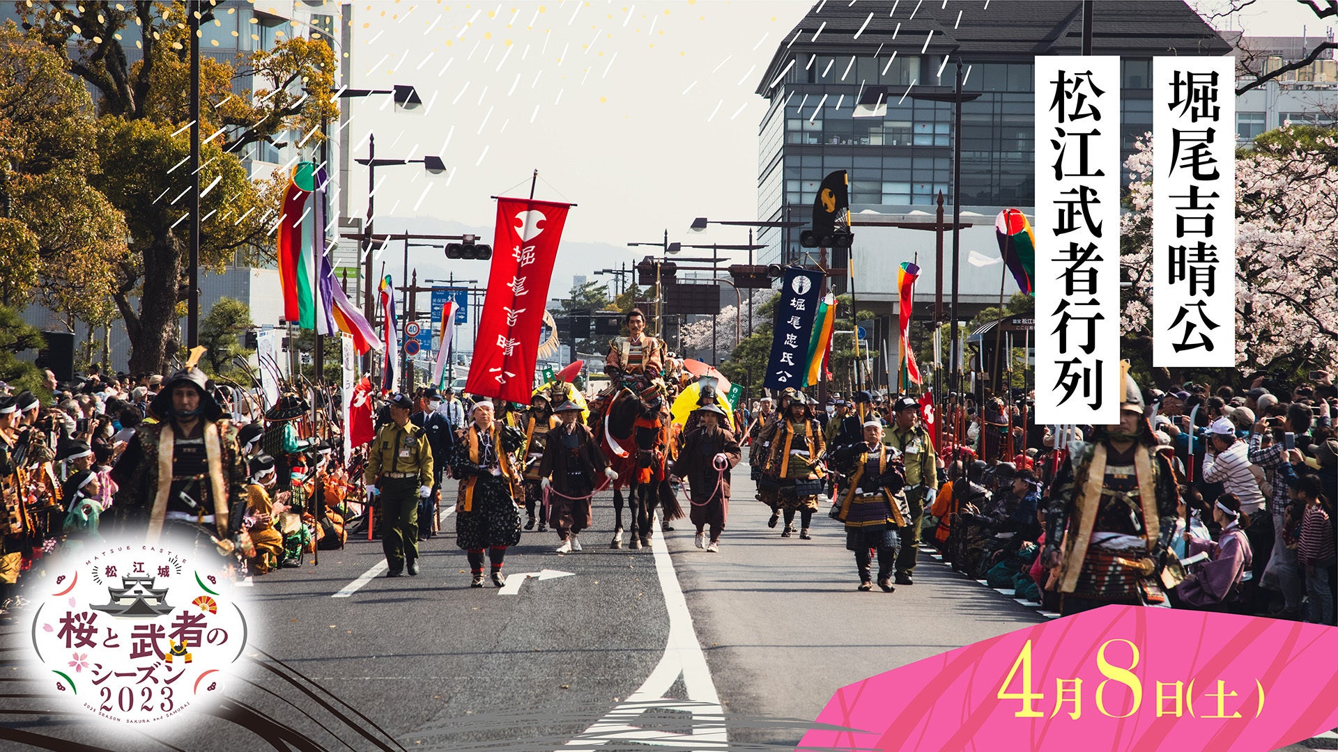 この春の「松江城 桜と武者のシーズン2023 」は、 2023年3月25日(土)~4月9日(日)の期間で開催される「国宝松江城・お城まつり 」、4年ぶりの開催となる 「第16代堀尾吉晴公・松江武者行列 」、そして今年初開催となる、武者行列のスピンオフ企画 「城中いきなり時代劇 」など、春の観光を楽しむイベントが盛りだくさんとなっております。松江城をはじめとする美しい風景や、癒しの空間、そして勇壮な武者との出会いなど、「松江城 桜と武者のシーズン2023」を通して、松江で春の観光の魅力を存分にお楽しみいただければと思っております。