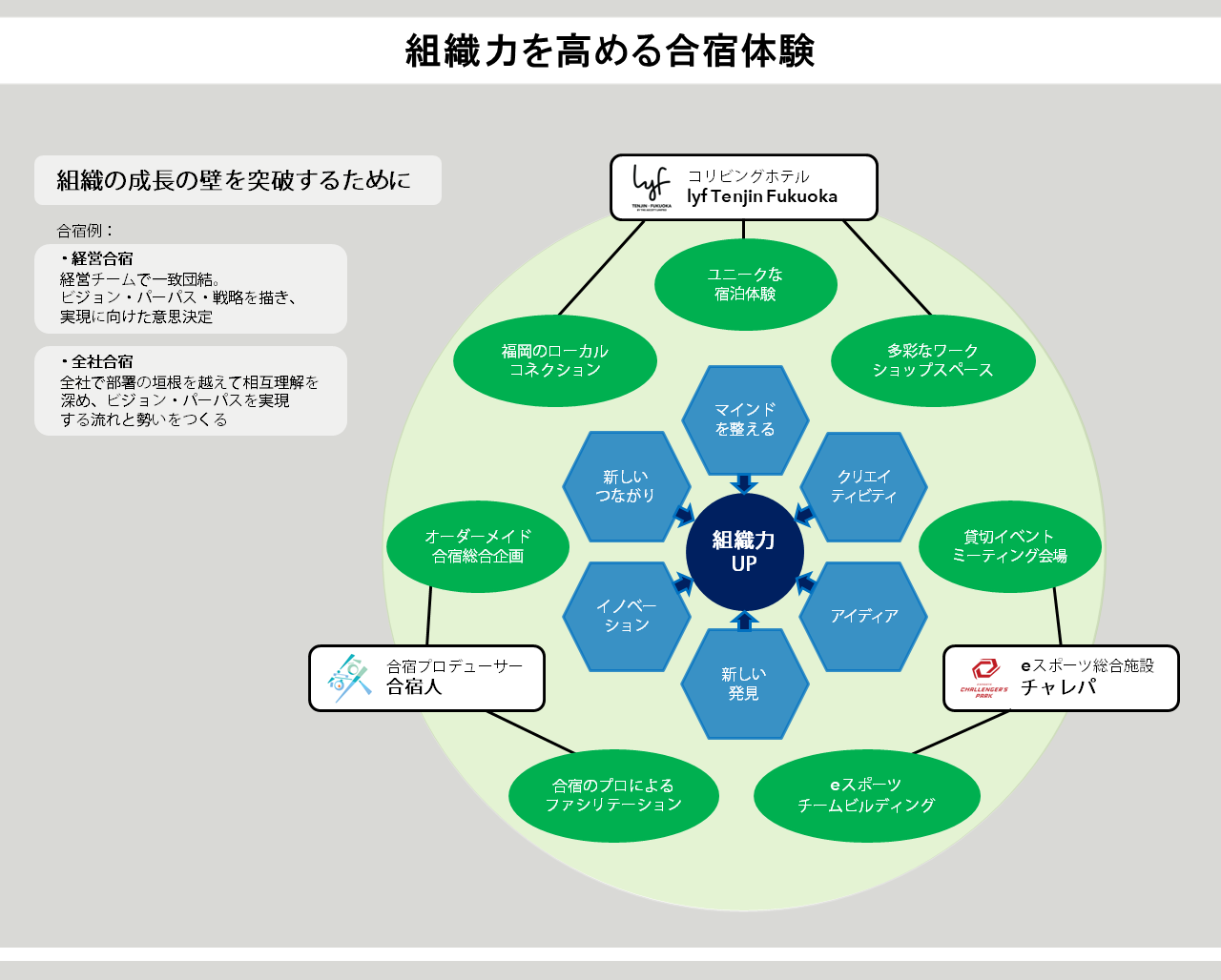 株式会社アスコットジャパン(本社:東京都港区、代表取締役 タン・ライ・セン)が運営するコリビングホテル lyf Tenjin Fukuoka(ライフ天神福岡/福岡県福岡市、支配人 井上絵梨)は、2023年3月6日(月)より、チーム合宿のプロ集団 合宿人(Co-Creations株式会社、本社:東京都千代田区、代表取締役 茂木健太)、eスポーツ総合施設 esports Challenger’s Park(チャレパ/福岡県福岡市(株式会社QTnet、本社:福岡県福岡市、代表取締役社長執行役員 岩﨑和人))とのコラボレーションで、企業や組織の目的に応じたオーダーメイドの合宿サービス「組織力を高める合宿プラン」を販売開始します。