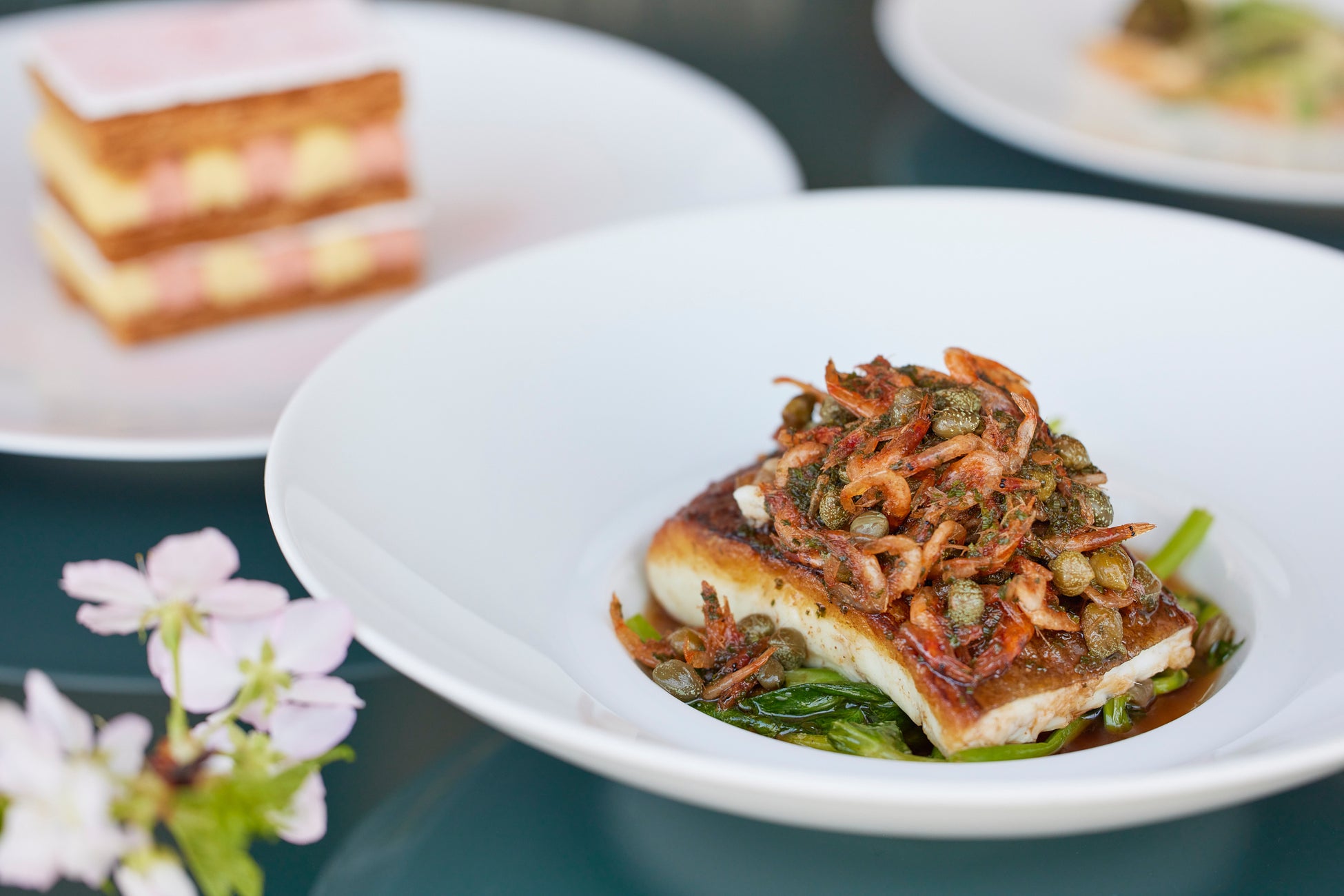 MAISON MARUNOUCHIの春のプリフィックスメニューは、季節の旬食材を使った3品のメニューが春限定でお楽しみいただける特別なコースです。日本各県の春食材を楽しむ旅へと誘います。山菜タルトは、サクサクのタルトにふきのとうやタラの芽といったその時々に合わせた旬の山菜を使用し、春の苦味と白カビチーズを合わせました。青森県産の肉厚な鮃は、香ばしい桜エビとケッパーのソースでお楽しみいただきます。デザートには、桜のミルフィーユをお楽しみください。