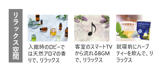 睡眠専門家からのアドバイスをうけた、睡眠の理論(※)に沿ったサービス(寝具・リラックス空間・入浴)