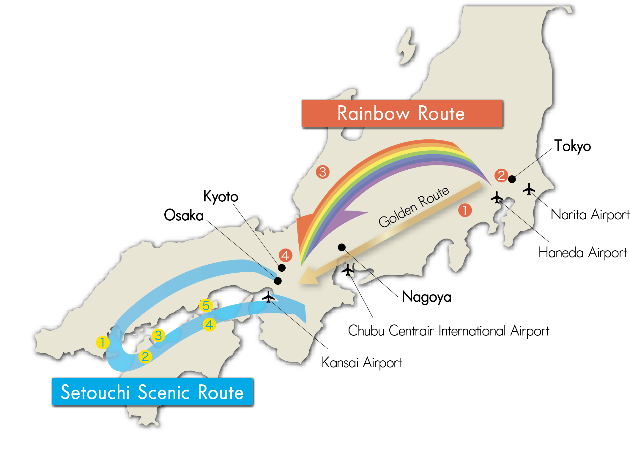 新ルートは、京都もしくは大阪が発着地となります。航空機を利用しアジア各国から直接瀬戸内エリアへ向かうお客様に加え、東京~大阪を結ぶ人気ルート「ゴールデンルート」や、「東京・金沢・京都を巡るレインボールート」のツアーから乗り継いでご利用いただくなど、大都市圏からの人流拡大も見込んでいます。