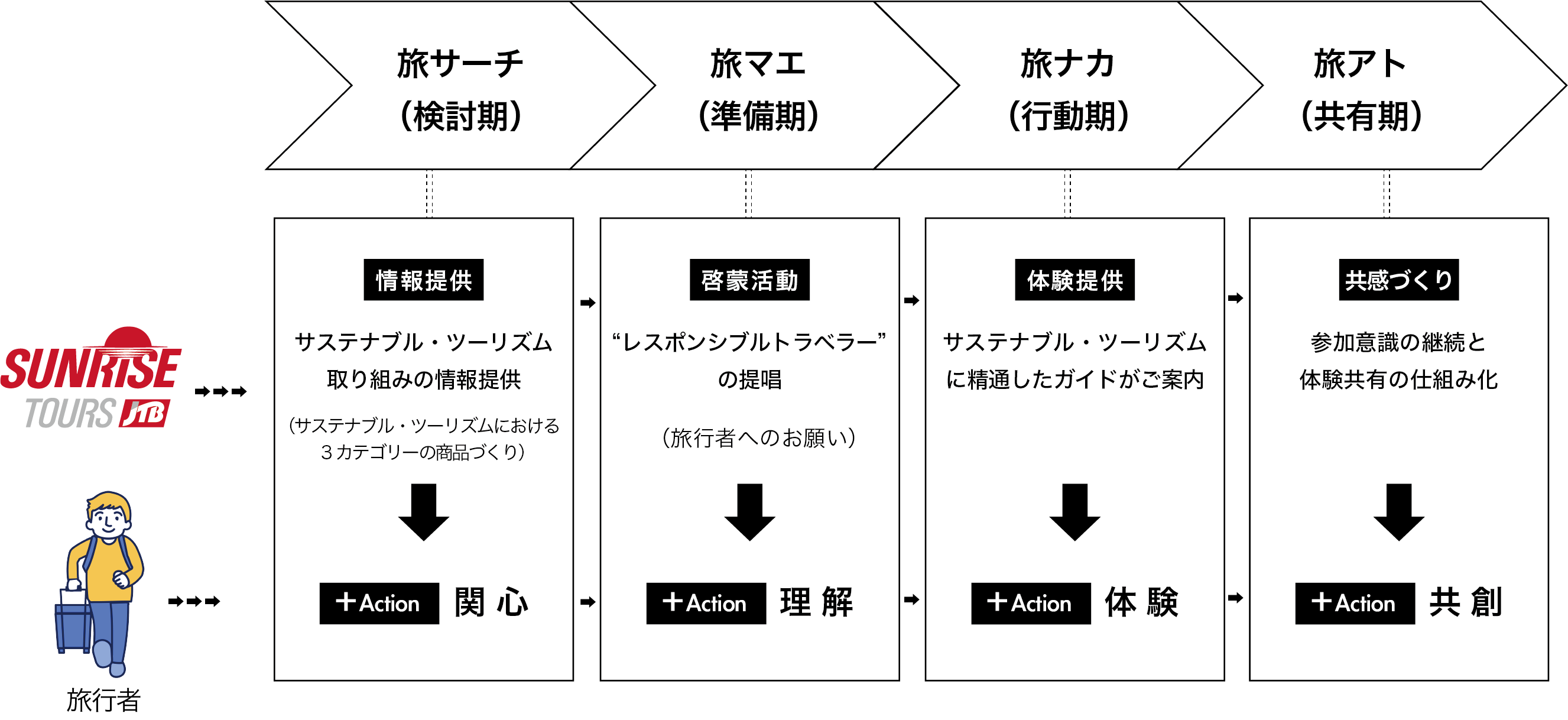サステナブル・ツーリズムの実現には旅行者自身の責任ある行動が重要であることから、サンライズツアーでは、旅の各シーン別の具体的な行動も提案していきます。一例として、旅マエには、“旅行地の未来をつくるレスポンシブルトラベラー”についての動画で旅行者の理解を促進し、旅アトにはSNS上で「#responsibletraveler」をつけた投稿を呼びかけることで、世界中にこの取り組みの輪を広げます。そして「旅行者」、「地域・コミュニティ」、「旅行会社」の共創による持続可能な新しい観光と社会の実現に貢献していきます。