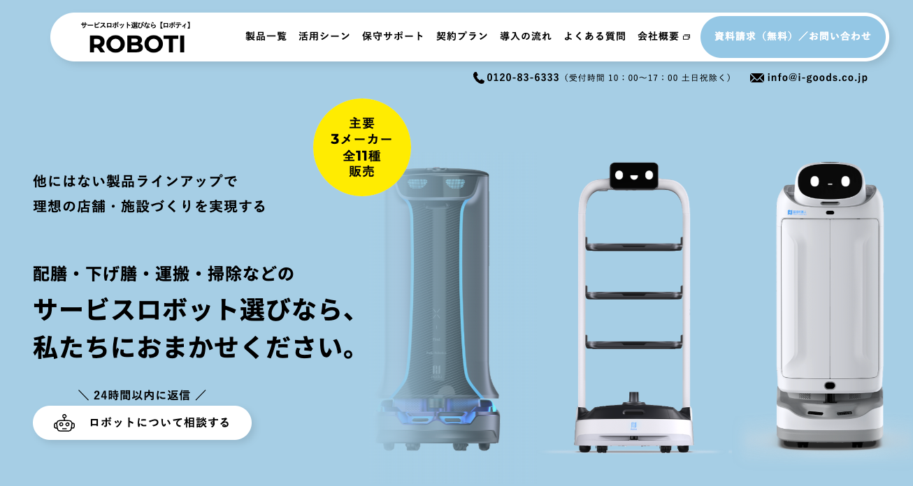 オリジナルグッズを製作するアイグッズ株式会社(本社:東京都渋谷区)は、配膳・下げ膳・運搬・案内・掃除などのサービスロボットを展開するブランド「ROBOTI(ロボティ)」の特設サイトをオープンしました。特設サイトを開設し、製品ラインナップを拡充することで、店舗・施設の課題解決に尽力します。