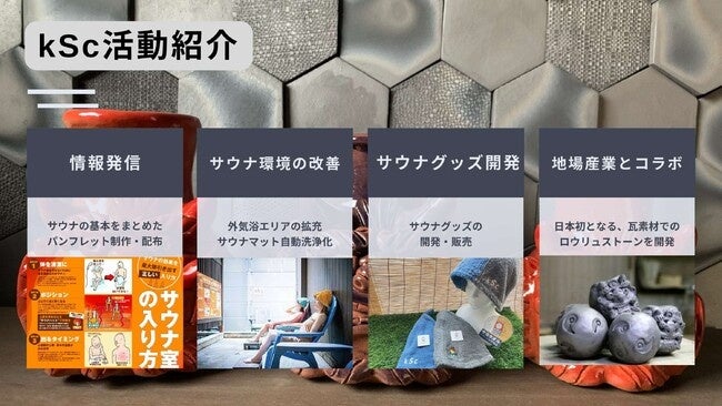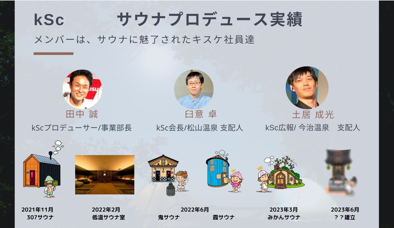 kScは、当社事業部長の田中誠氏を発起人に、「サウナの魅力や楽しさを世の中に広めたい!」という強い思いを持つ3人によって始動。①サウナ情報・魅力の発信、②快適なサウナ環境の整備、③地域への貢献という3本柱を原則に、特色あるサウナ開発と、エンターテイメントを意識した独自のイベントを開催してきました。