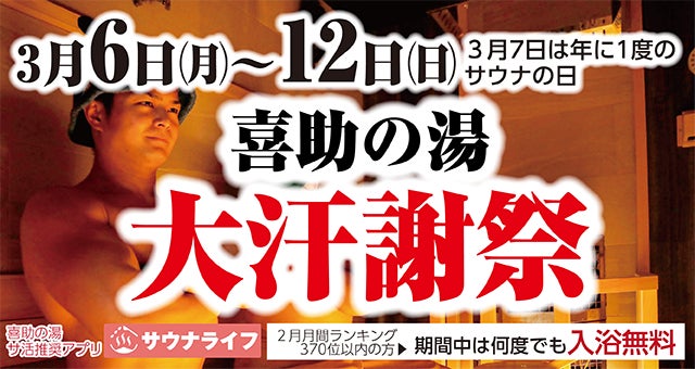 総合エンターテイメント企業・キスケ株式会社(本社:愛媛県松山市、代表:山路義則)が運営する「伊予の湯治場 喜助の湯」が、2023年3月7日発表の「ニフティ温泉 サウナランキング2023」(ニフティライフスタイル株式会社主催)において、全国16,398施設の中から、栄誉ある1位を受賞しました。この受賞を励みに、地元のお客様はもちろん、県外からのお客様にもご満足いただける施設としてさらに精進してまいります。