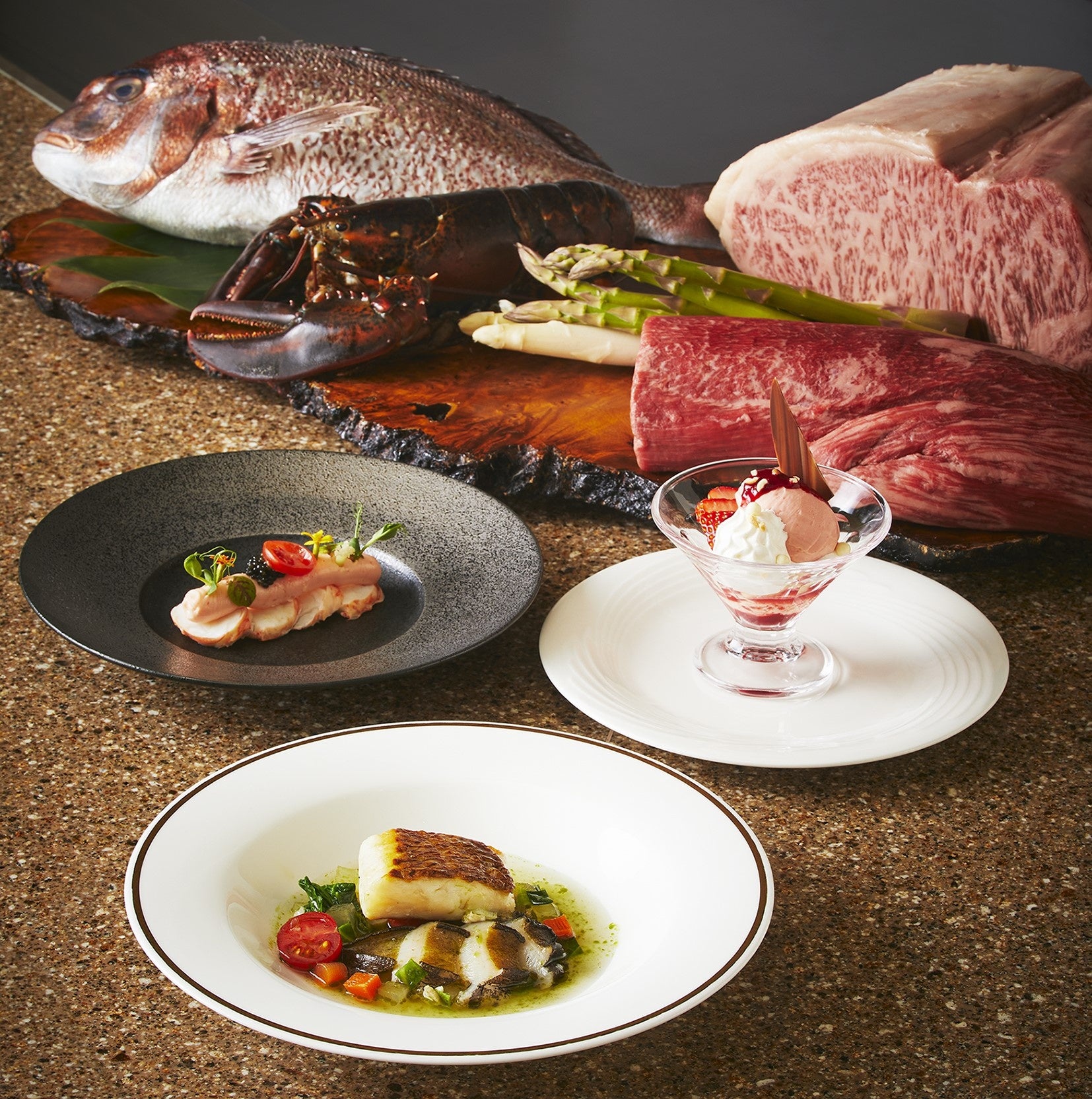 前菜には、オマール海老を春らしくさっぱりとした味わいのトマトムースと合わせてご提供します。また、鉄板でソテーした真鯛とエゾアワビにバジルベースのスープで仕上げる魚介料理は、海の幸を生かした優しい味わいと豊かな香りが食欲をそそります。食感と素材の旨みを存分に引き出しながら焼き上げる九州産和牛ステーキやみずみずしい春の焼き野菜は鉄板焼の醍醐味と言える一品。