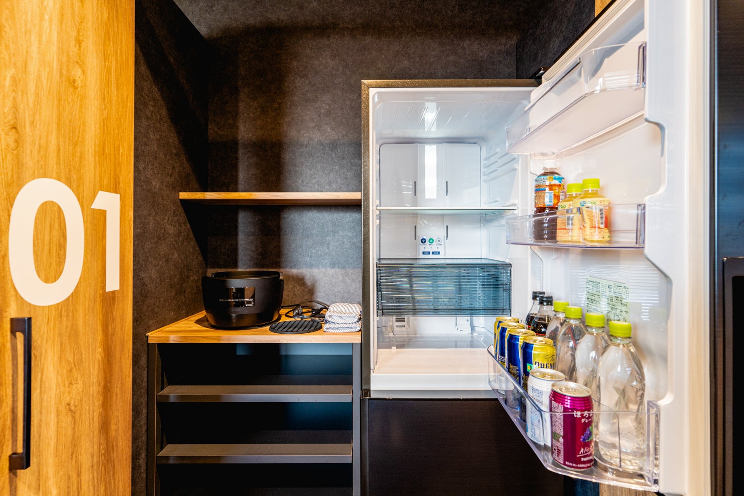 客室には冷蔵庫や電気ケトルなどのキッチン家電や食器類に調理器具など手ぶらでも安心の充実した設備を