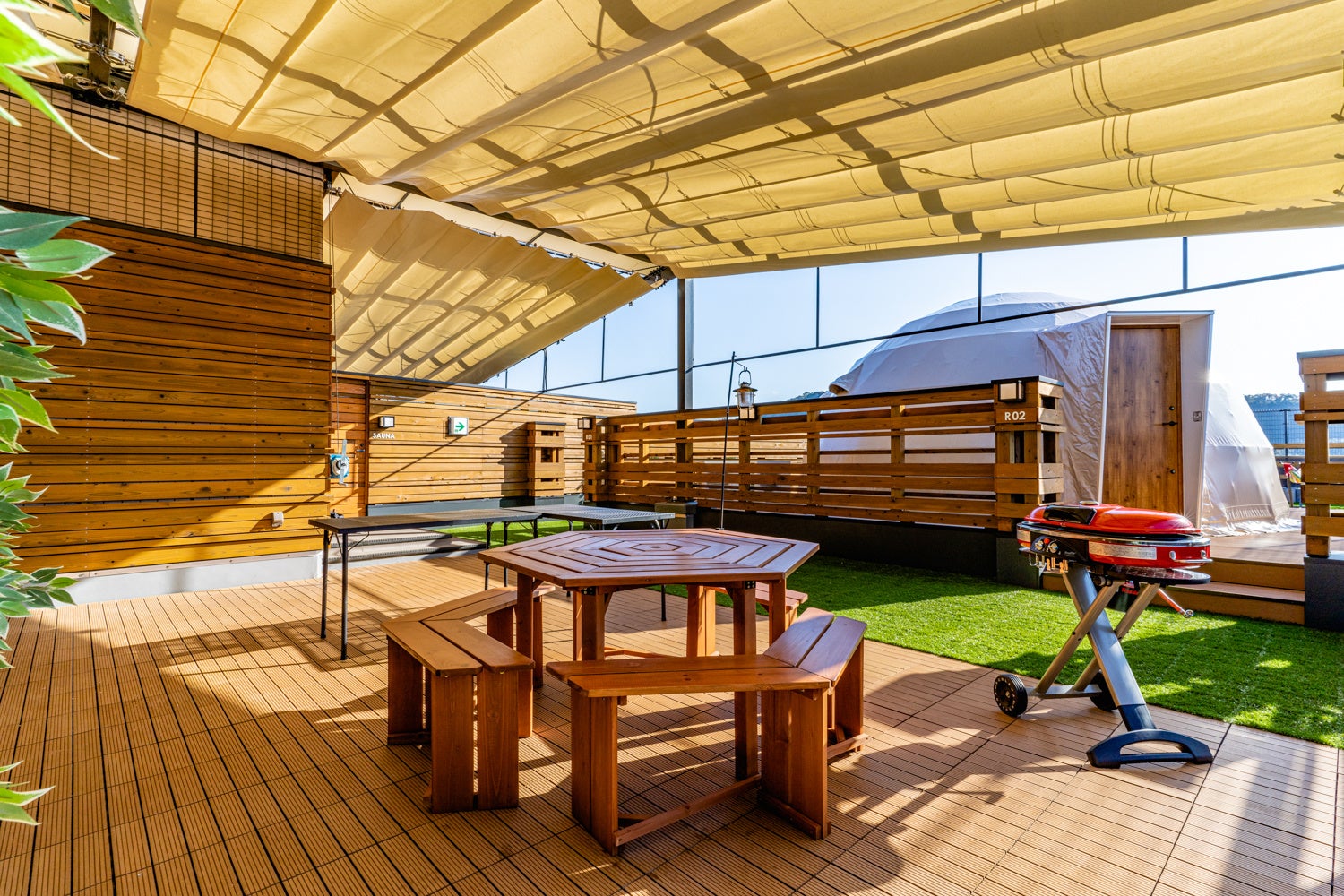 また、グランピング専用の屋外食事スペースは全天候型となっており