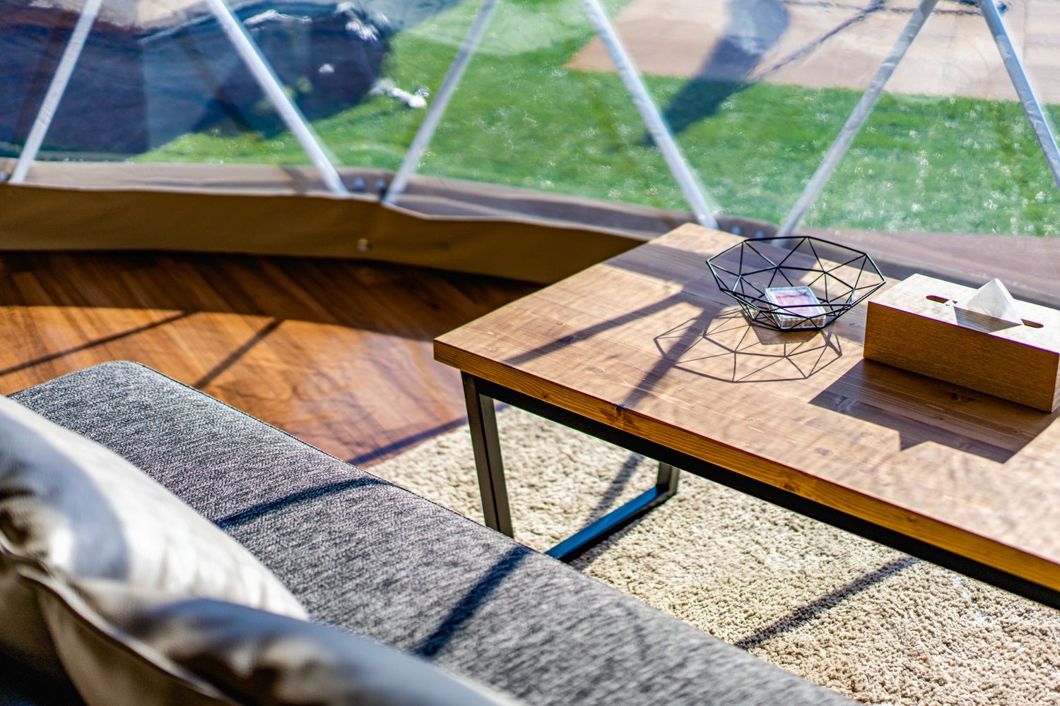 ⑤快適なプライベートグランピング 開放的な食事スペースと充実した客室設備