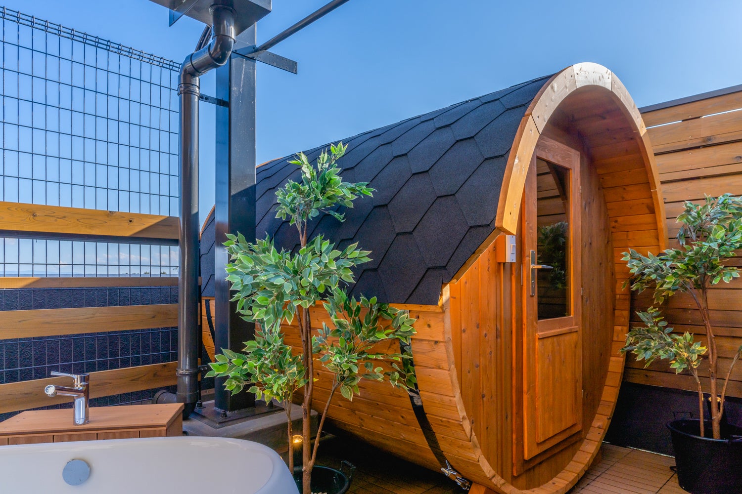 ③開放的な屋上での“ととのい”体験 北欧風バレルサウナ