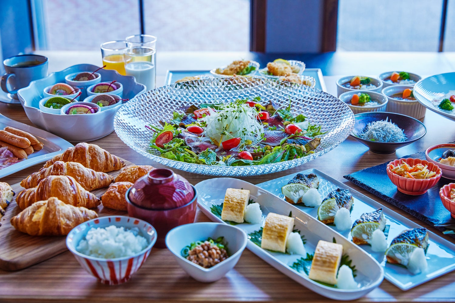 サラダ/ポテト/ハム/ベーコン/ウインナー/スクランブルエッグ/ヨーグルト/フルーツ/焼きたてクロワッサン/ジュース/牛乳/コーヒー紅茶/大人気シェフ特製カレーライスなど