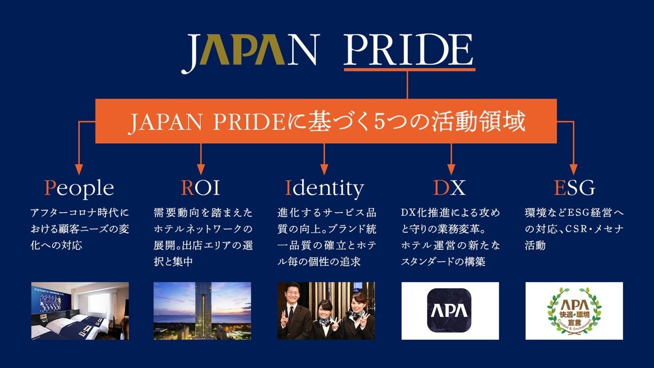 アパホテルネットワークとして全国最大の719ホテル110,395室(建築・設計中・海外、FC、アパ直参画ホテルを含む)を展開している。 2010 年 4 月にスタートした「SUMMIT 5(頂上戦略)」を継承し、2022 年 4 月より新たな 5 ヶ年計画「AIM5 ~APA Innovative Movement」を始動。アフターコロナにおけるニーズの変化や DX 化の波を捉えながら、国内で圧倒的な No.1 ホテルチェーンと なるべく、2027 年 3 月末までにアパホテルネットワークとして 15 万室展開を目指す。 ※建築・設計中含む