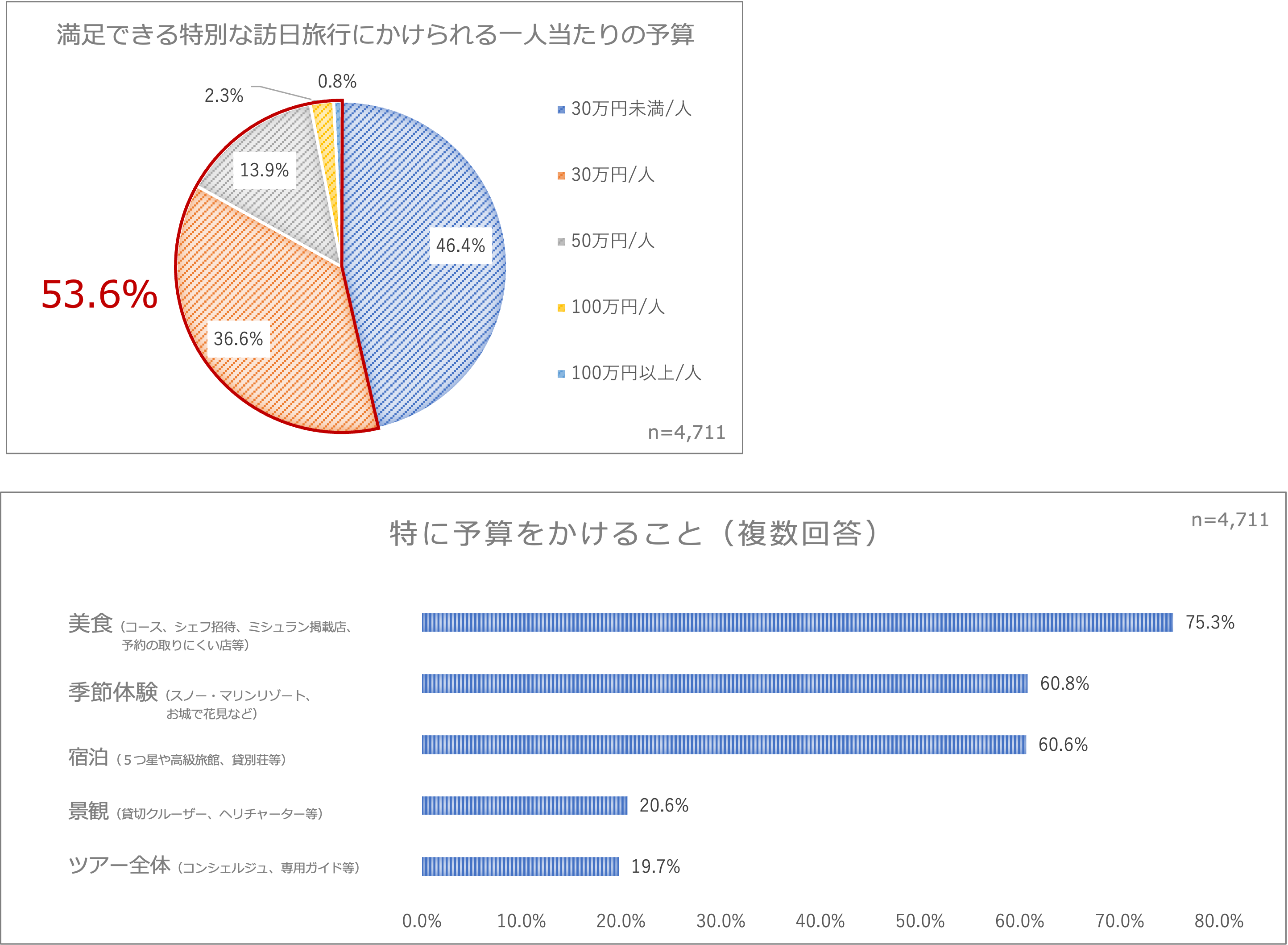 ◆コロナ前の訪日台湾人一人当たりのインバウンド消費額が12万円前後(*2018年:127,579円、2019年:118,288円。出典:観光庁 訪日外国人消費動向調査)であるのに対し、今回の調査で[満足できる特別な訪日旅行にかけられる予算]を聞いたところ、「30万円以上」と回答した人が53.6%と、過半数が高付加価値体験を得られるならこれまでの平均額の2倍以上の出費もためらわないという結果になった。
