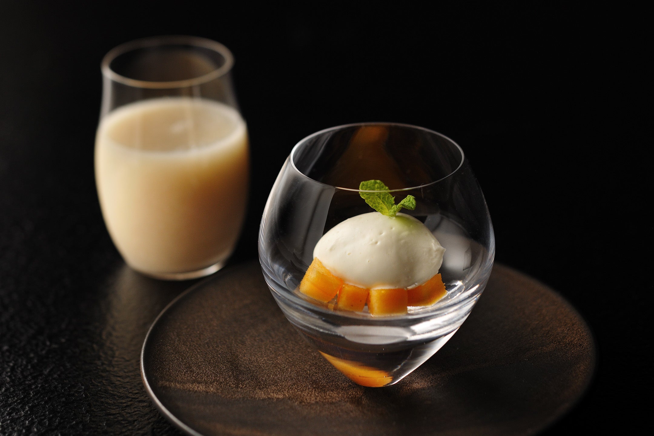 お米と米麹、水を原料とし発酵させたどぶろくのアイスクリームです。必須アミノ酸や天然の乳酸が多く含まれ、お米の甘味と乳酸の酸味が爽やかな一皿を提供します。フルーティーな味わいが特徴のどぶろくを使用しているので、コースの最後を爽やかに締めくくるデザートです。