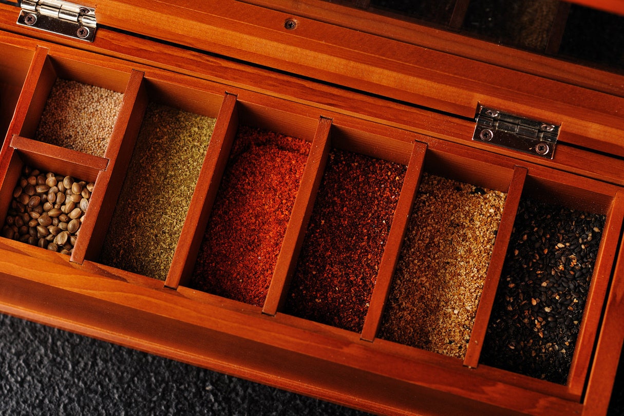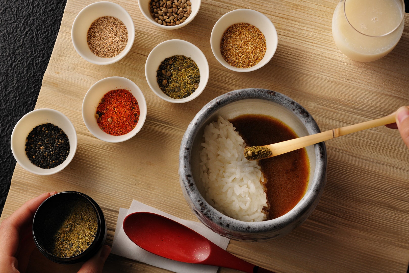 カレーにあわせる香辛料は、1625年、江戸の両国薬研堀(現在の日本橋)にて創業した「やげん堀七味唐辛子本舗」によって調合された「七色唐辛子」です。七つの香辛料や薬味を配合した七味唐辛子は、効果や薬効も考え調合されていて、当時は「七色唐辛子」とも呼ばれていました。暑気払いカレーでは、食欲増進や血行促進、発汗作用があると言われる唐辛子類に、胃腸の機能を高めると言われる香り高い「山椒」(*8)が多めに調合された「七色唐辛子」をカレーにかけて味わいます。山椒のもつ爽やかな香りとしびれる辛味が、カレーの風味を引き立たせ、味わい深くなるだけでなく、身体の発汗が促され、体内にこもった熱を外に逃がします。