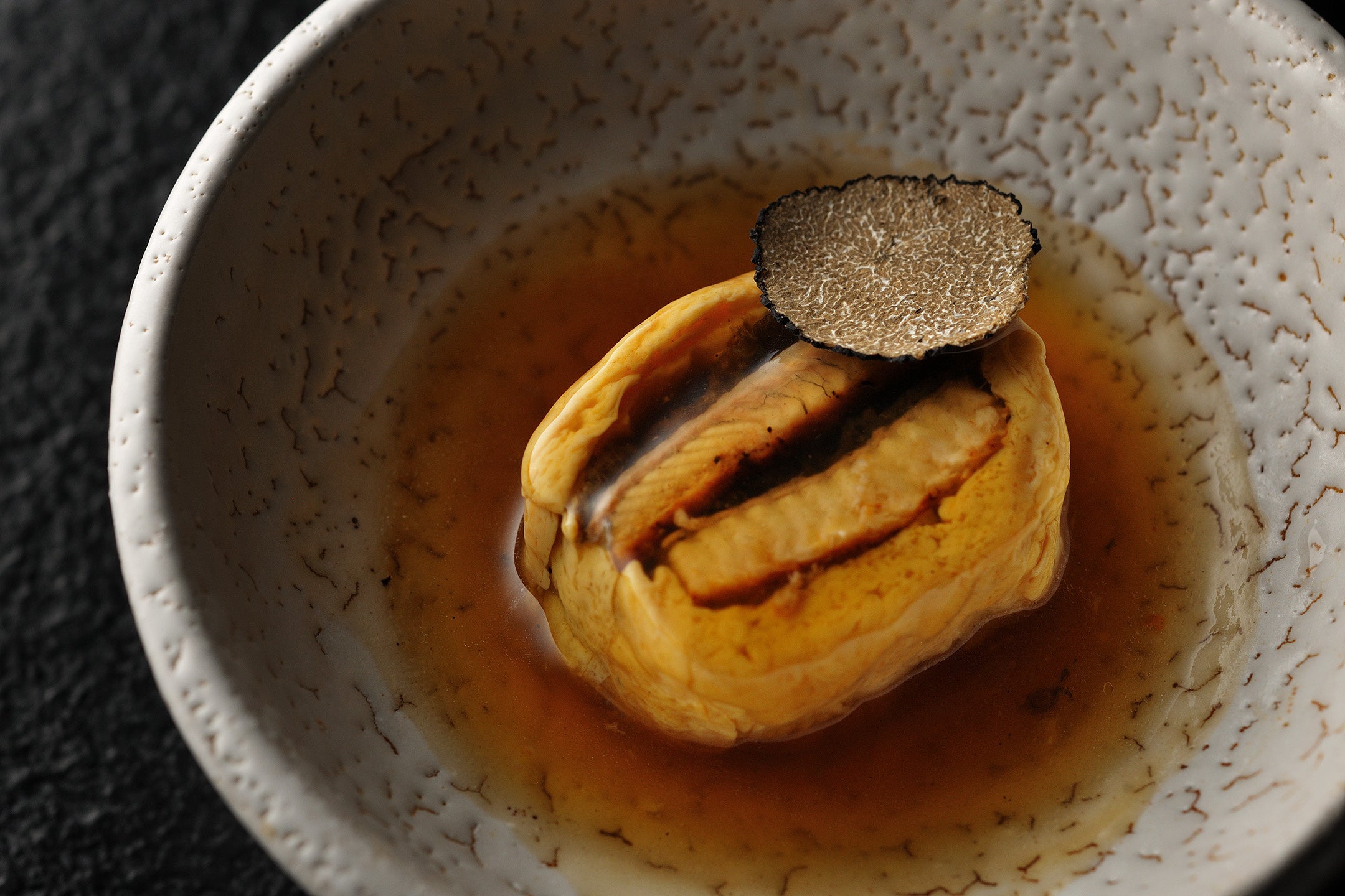 江戸の頃より夏の風物詩として有名な鰻は、疲労回復に効果的といわれるビタミンB1を多く含んでいます。(*2)コースのはじめに提供するのは、丁寧に炭火で焼かれた鰻の炭の香りを閉じ込めるように卵で包んだ前菜です。餡にも鰻の骨からとったコンソメを使うことで、一層、鰻の香りを楽しむことができます。