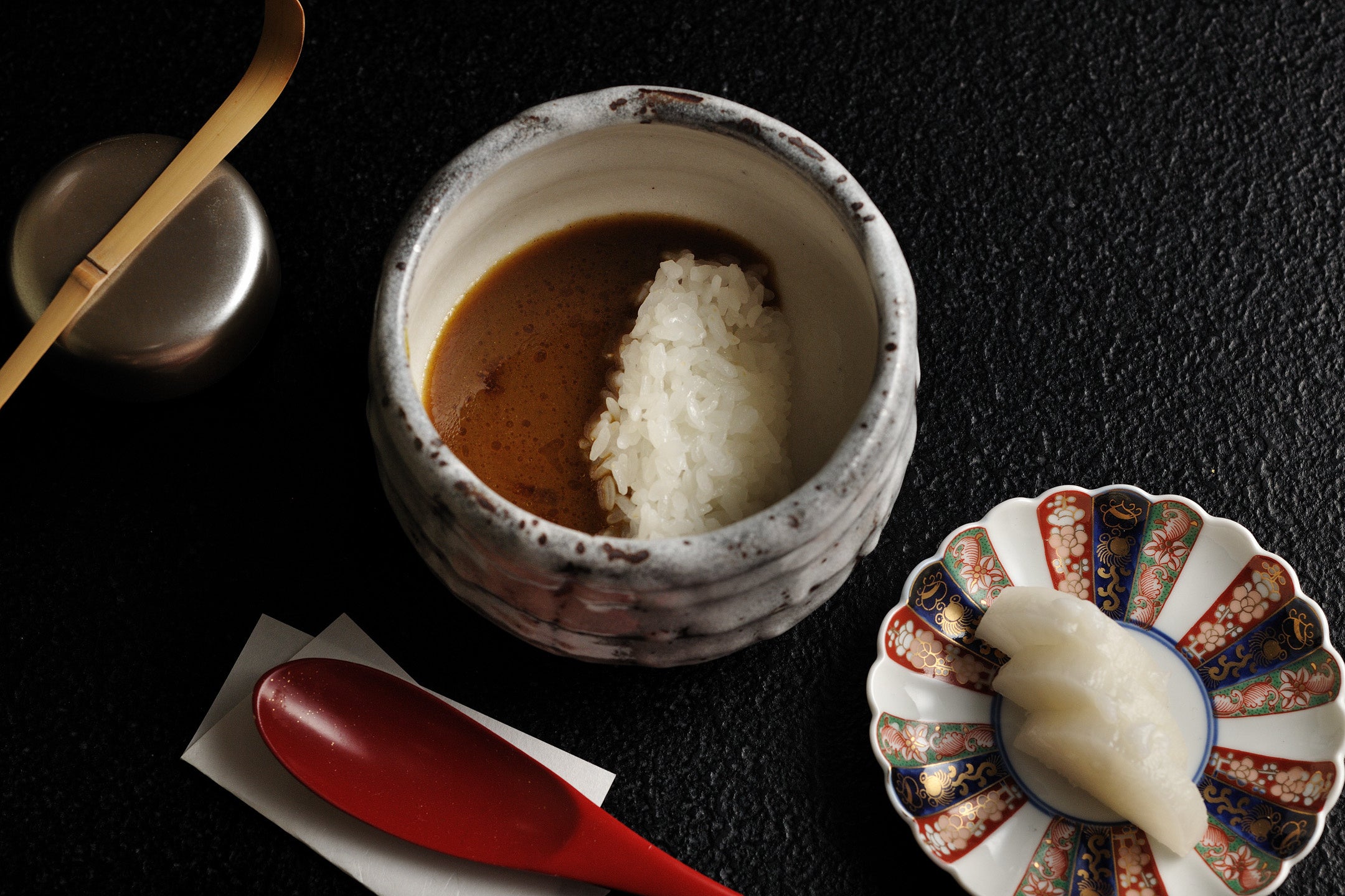 メインのカレー2種は、順番に提供します。最初に提供する「星のや発酵カレー」は丁寧に引いた魚出汁を使用し、玉ねぎや人参、生姜、牛肉といった食材を1日かけて、じっくりと煮込んだカレーです。大豆を麹菌で約15ヶ月発酵させた「浜納豆」と、大豆を使わず魚を麹で発酵させた「魚味噌」を加えることで、奥深い旨味を引き出します。煮込んだ具材は、カレーに全て溶け込んでいるため、暑い夏の朝でもさらりと食べることができる仕立てです。このカレーにあわせるお米は、蒸らす前の水分が多く含まれたやわらかく、甘い「煮えばな(*6)」です。スタッフが炊き加減を確認しながら、一番良いタイミングで提供します。
