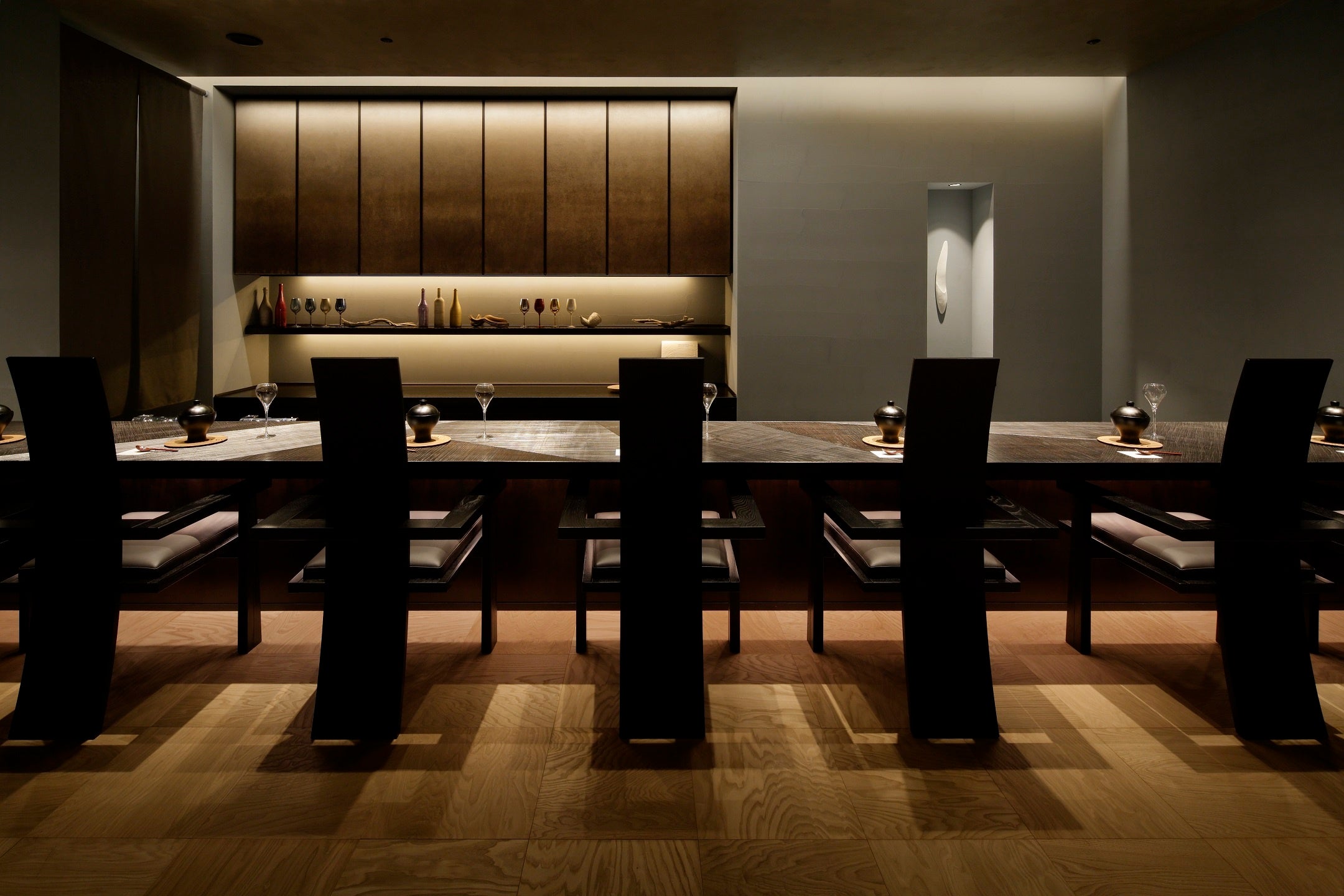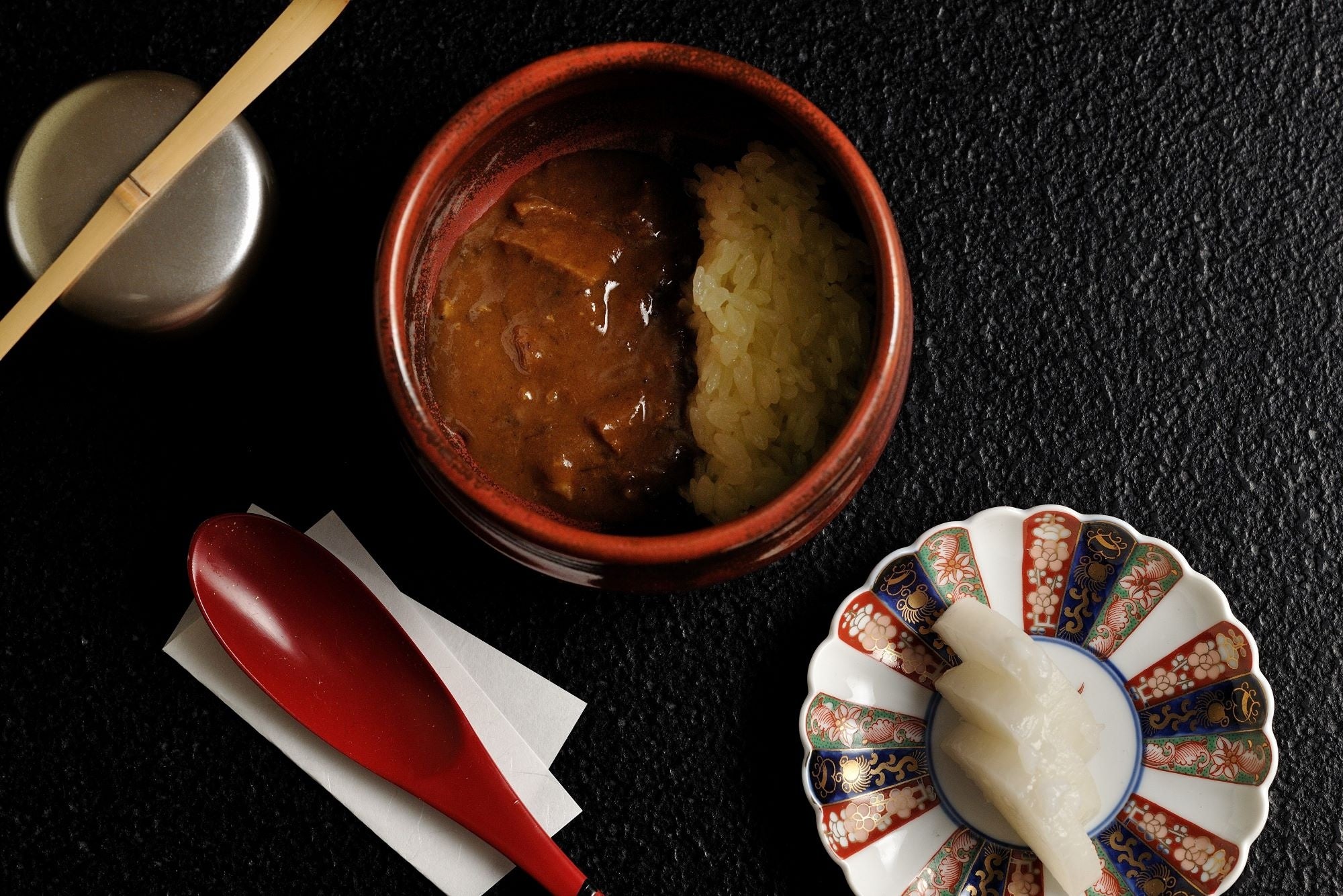 星のや東京の地下1階にあるダイニングは、地層をイメージした左官仕上げの壁が特徴的な空間です。カウンター席の静かな空間で、カレーを味わうことができます。スタッフが目の前で、米の炊き時間や蒸らし時間、カレーの煮込み加減などを見ながら、一番良いタイミングでカレーを提供します。さらにカレーをよりおいしく味わえるように、器やカトラリーの選定にもこだわりました。器に使用するのは、香辛料や薬味の香りやカレーの風味をしっかりと感じることのできる抹茶椀です。カトラリーには、素材本来の味わいや口当たりを感じられるように、漆塗りのスプーンを用意します。