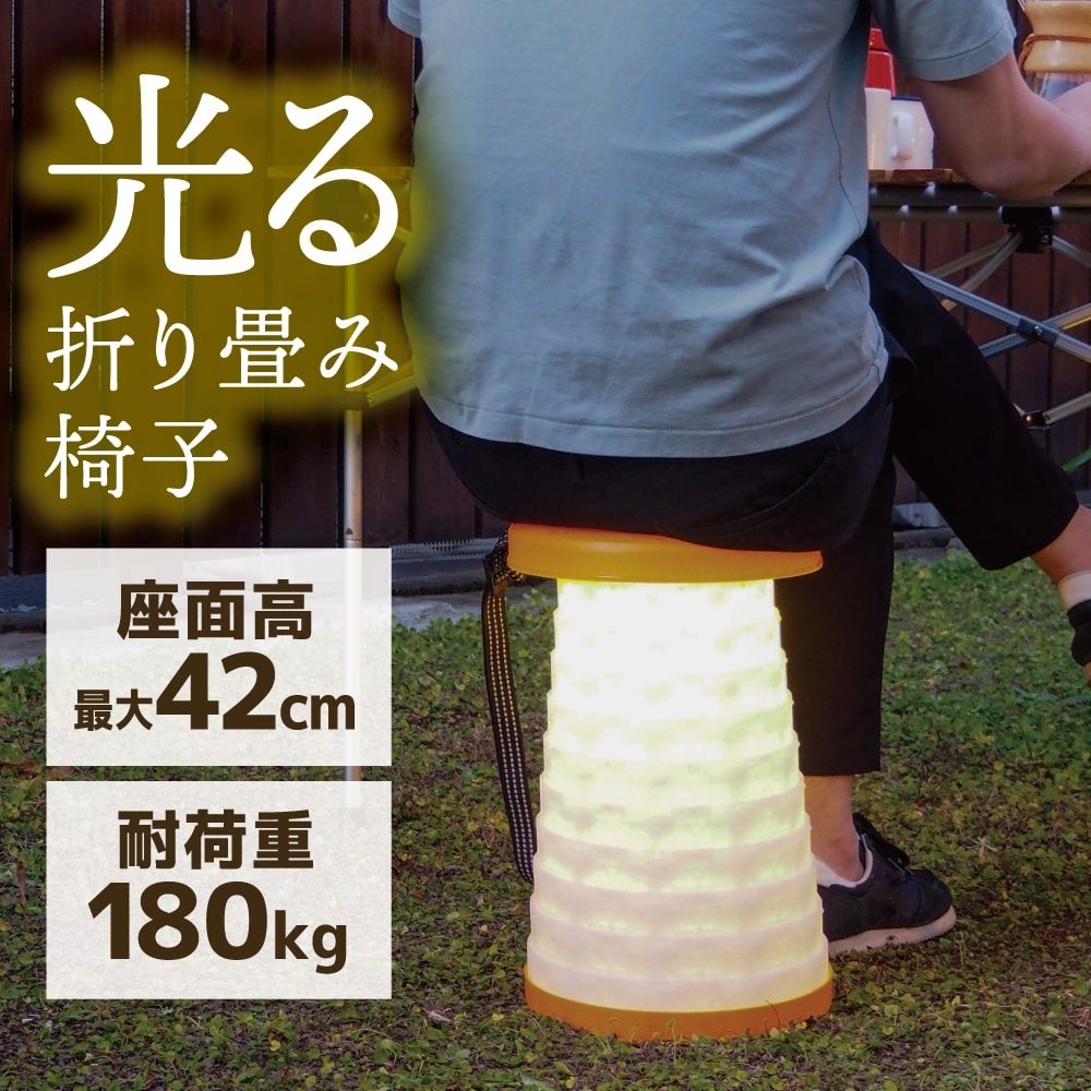 ロックできる溝が11か所あり、6.5~42cmの好きな位置で固定が可能。大人でも子供でもシチュエーションに合わせて高さを変えて座ることができます。本体内部にLEDを搭載。天面部のボタンを押すとLEDが点灯。イス全体が明るくなり暗い場所でもランタンとしてお使いいただけます。ボタンを押すごとにグラデーションモード、点滅モードに切り替えてお使いいただけます。電源は単三電池2本使用。肩から掛けられるベルト付きで簡単に持ち運びができます。