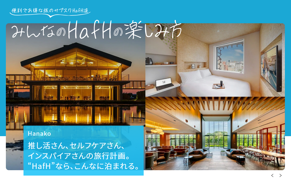「HafH(ハフ:Home away from Home)」は、サービス内で獲得できる《HafHコイン》を使って宿泊する「旅のサブスク(R)」サービスです。観光や出張目的だけでなく「住む」「働く」「日頃の気分転換」など新しい旅のスタイルを提供しています。