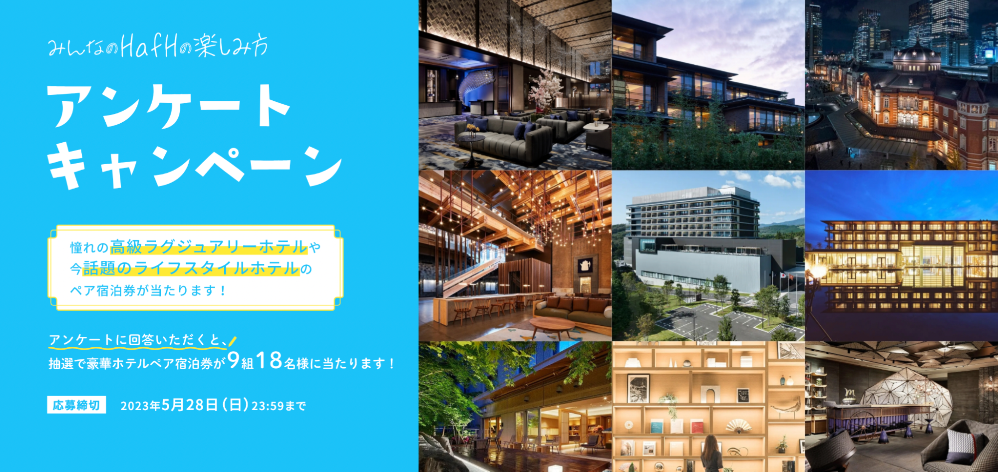 また、「みんなのHafHの楽しみ方」オープンを記念して、「憧れの高級ラグジュアリーホテルや、今話題のライフスタイルホテルのペア宿泊券プレゼントキャンペーン」を実施いたします。特設サイト内のいずれかの記事を読み、アンケートにお答えいただいた方の中から抽選で9組18名様にホテルペア宿泊券が当たります。