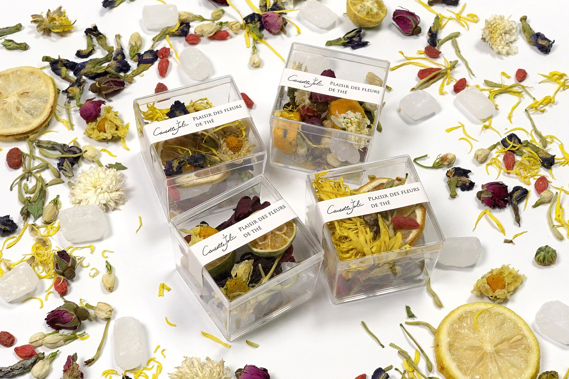 四季の移ろいを色にしているコゼットジョリからリリースする「Plaisir des fleurs de thé」プレジールデ・フルール・ドゥ・テ(茶花の楽しみ)は、お茶の種類は定番5種。