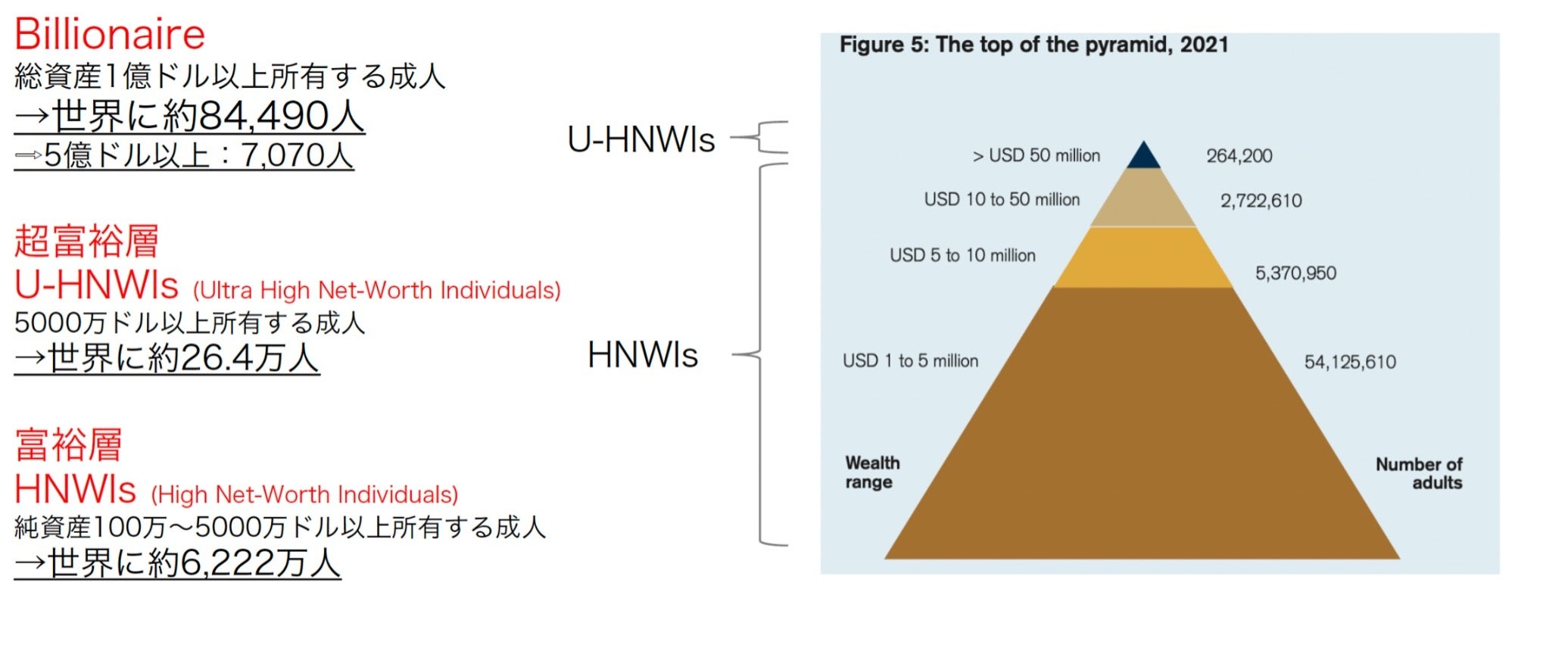クレディ・スイスによると2021年、富裕層は全世界で約6,222万人いると推定され、2020年以降、20年間で約4.5倍に増えています。