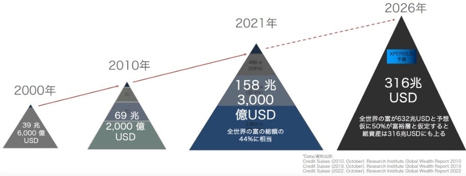 資産額も同様に大幅な増加トレンドにあり、2000年時点における富裕層の資産額が39兆6,000億米ドル、世界の富の34%を占めていたのに対し、2021年にはその約4倍となる158兆3,000億米ドル、その割合は44%相当にまで増えています。