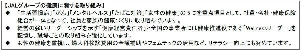 JALグループは今後も、「世界で一番お客さまに選ばれ、愛されるエアライングループ」を目指して、その原動力である社員と家族のため、健康経営を推進し続けます。