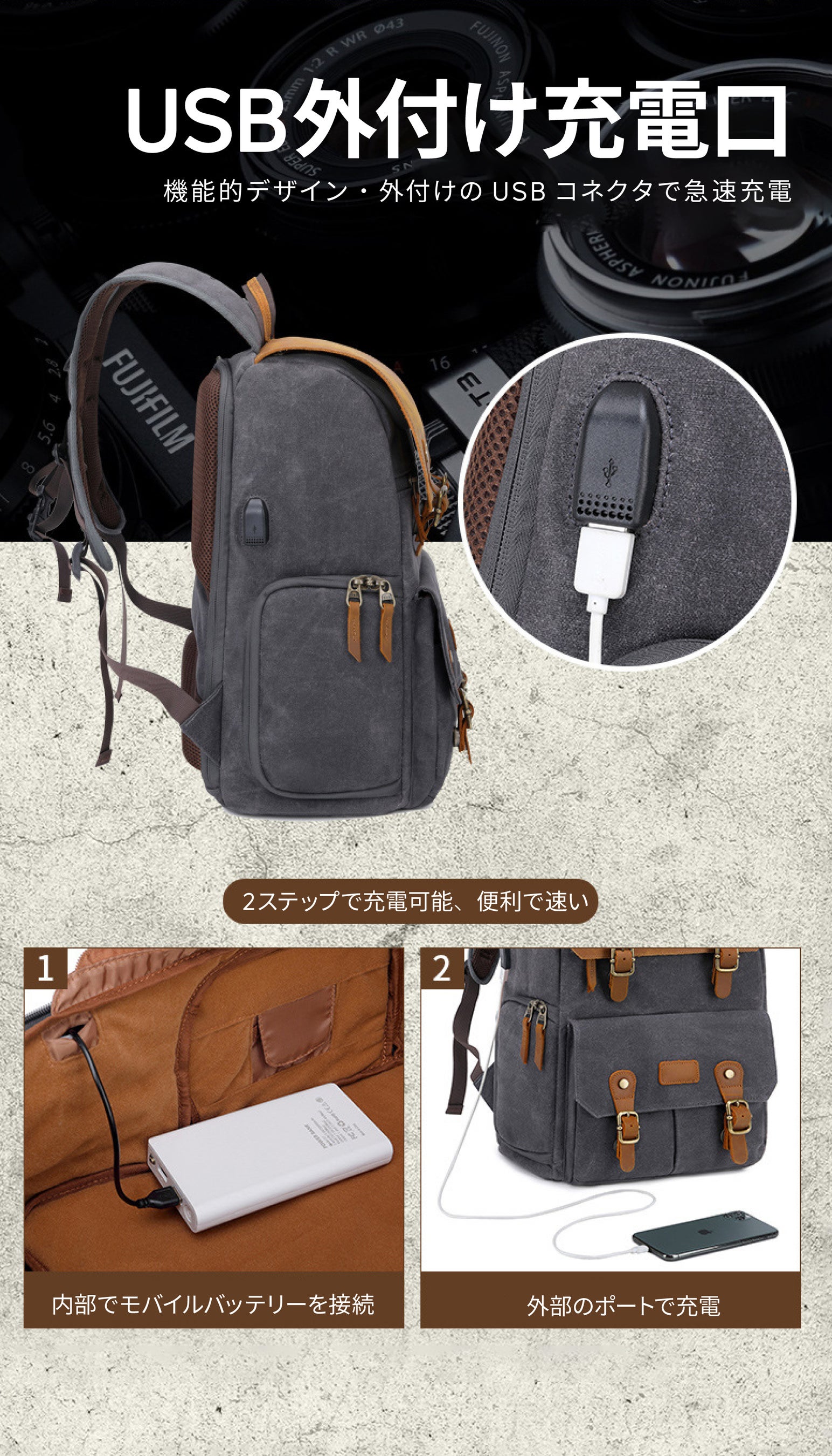 Gamp Packは小さいUSBポートが本体横についているので、充電しながらバックパックを使用することができます。