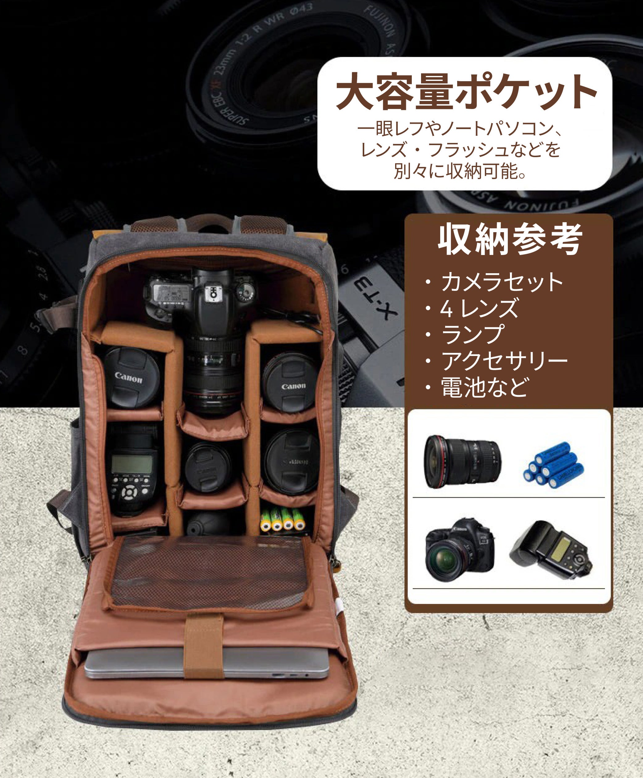 バックパックの中はカメラや電子機器を効率よく収納できるようにブロック分けされています。