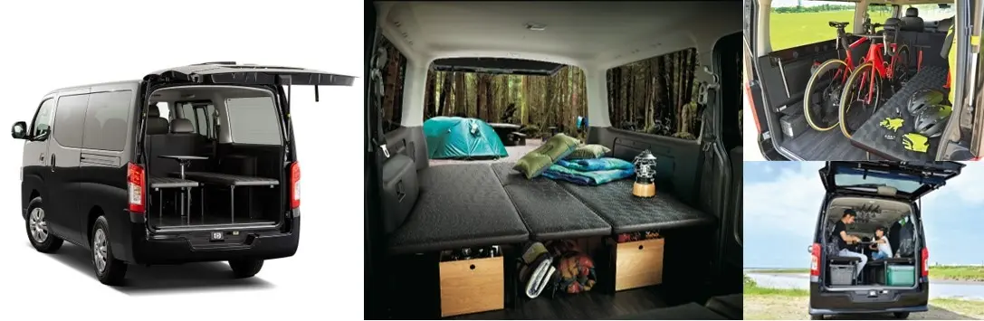 車中泊を目的としたユーザー向けにラインアップされる「キャラバン マルチベッド」は、荷室に折りたたみタイプのベッドを搭載し、さまざまなベッドアレンジによりシーンに合った使いわけが可能です。