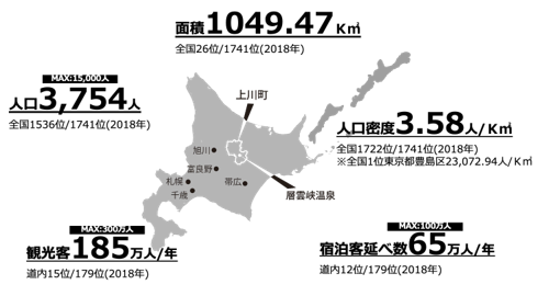 大雪山国立公園を有する上川町は、自然環境や町の資源と共存する観光のあり方を模索しながら、 “通年型山岳リゾート”を目指しています。特に、大雪山系の黒岳を中心とした登山やアウトドアを目的とする観光客も多く、層雲峡温泉など豊富な自然環境も合わせアウトドア需要の拡大に合わせ様々な取り組みを推進しています。