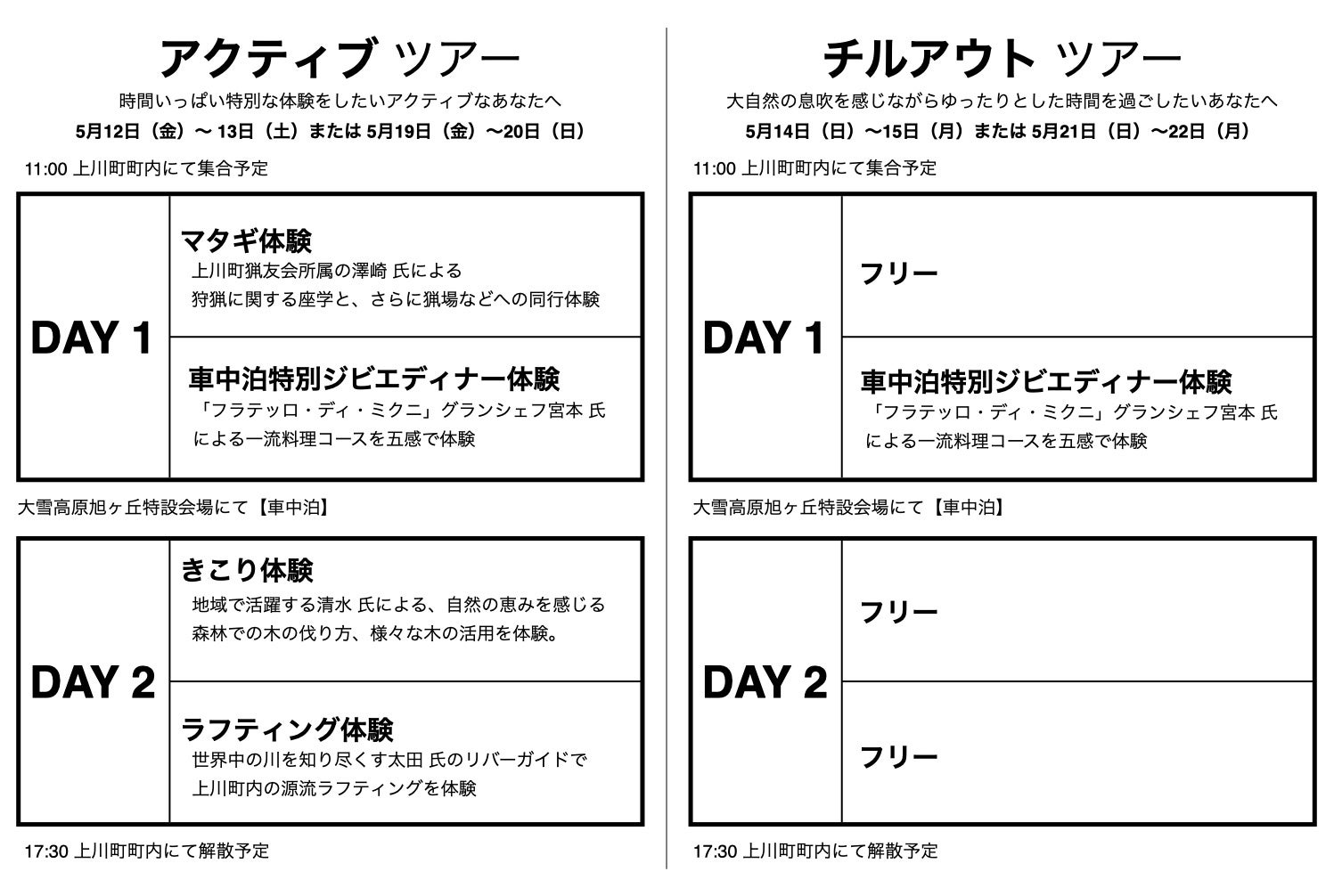 体験内容:両プランともにフラテッロ・ディ・ミクニでの1日目の夕食、お土産付き。アクティブツアーは一連のアクティビティ体験付き。チルアウトツアーは食事以外は自由行動。車中泊は、大雪高原旭ヶ丘 車中泊体験特設会場での日産キャラバン(マルチベッド仕様)