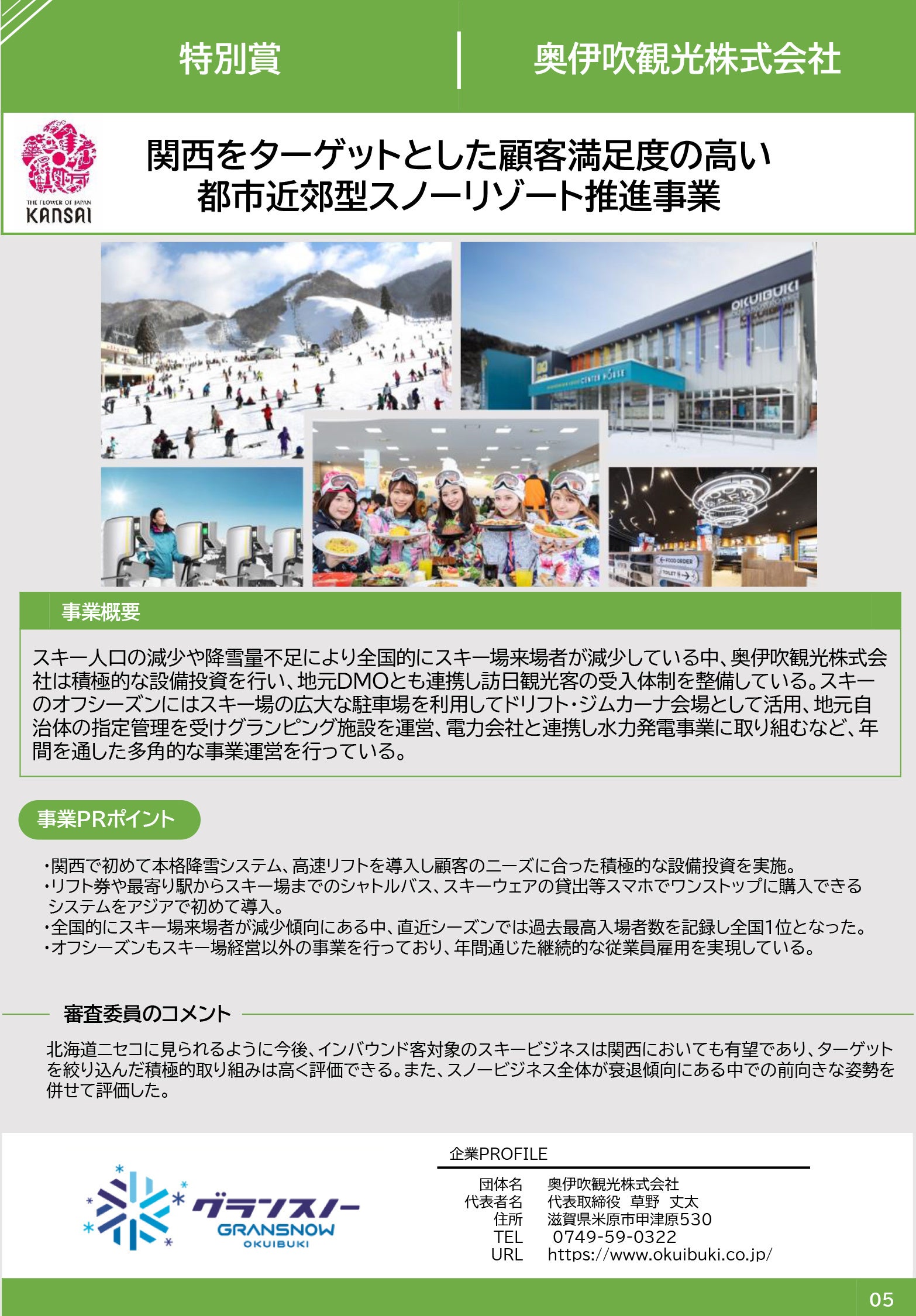 「近畿経済産業局」主催の「第6回はなやかKANASAI魅力アップアワード」にて、関西をターゲットとした顧客満足度の高い都市近郊型スノーリゾート推進事業を取り組むグランスノー奥伊吹を運営する「奥伊吹観光株式会社」が「特別賞」を受賞。