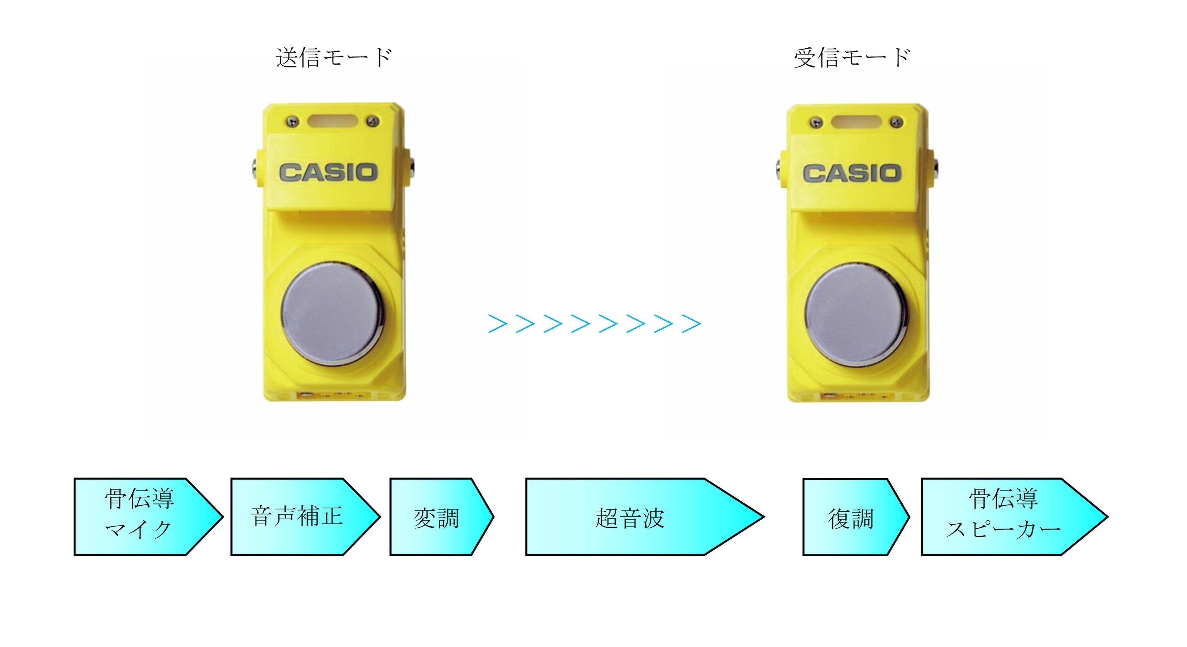 山形カシオが開発し、2013年1月に発売した“Logosease”は、レジャー用の水中マスクに装着し、超音波と骨伝導によってレギュレータを咥えたまま水中での会話を手軽に実現できることから、筆談や手信号でのコミュニケーションが一般的なダイビングの世界に会話を楽しむという新しい価値を提供。また、レジャーでの利用に加えて、消防や警察の水難救助隊、港湾での潜水作業、海洋学校の潜水実習といった、さまざまな場面で活用されています。