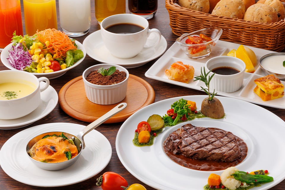 ブッフェコーナーには、サラダバー・デリ・スープ・パン・ライス・デザート・ドリンクバーを用意しており、こちらはお好きなだけ食べ放題・飲み放題でご利用いただけます。