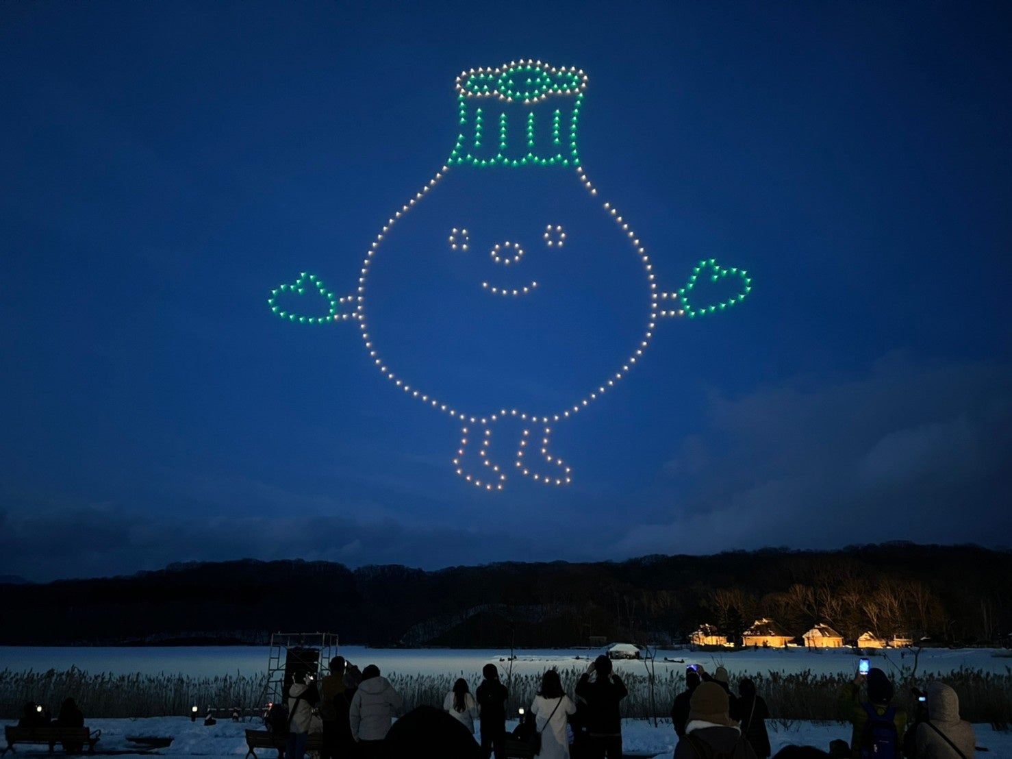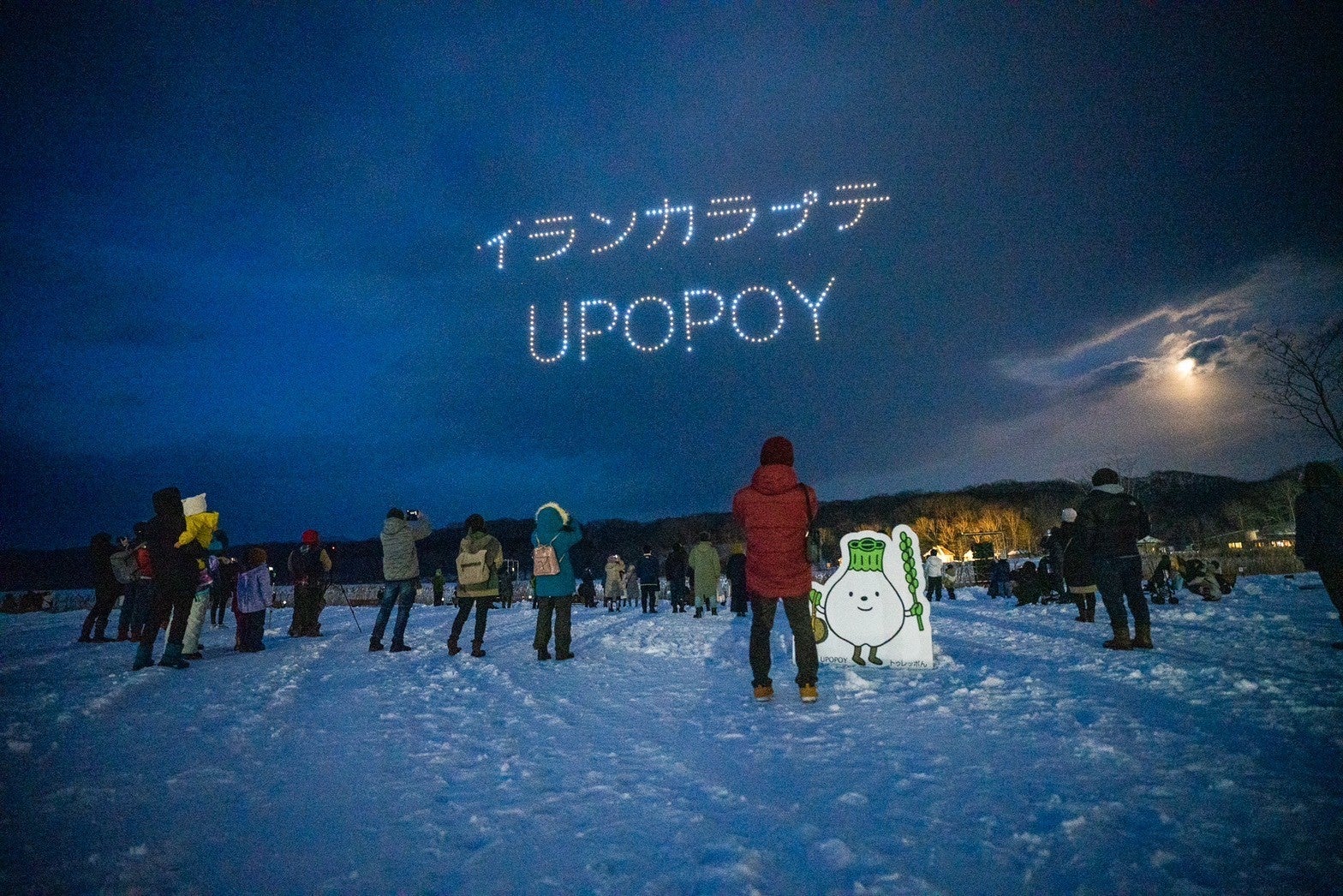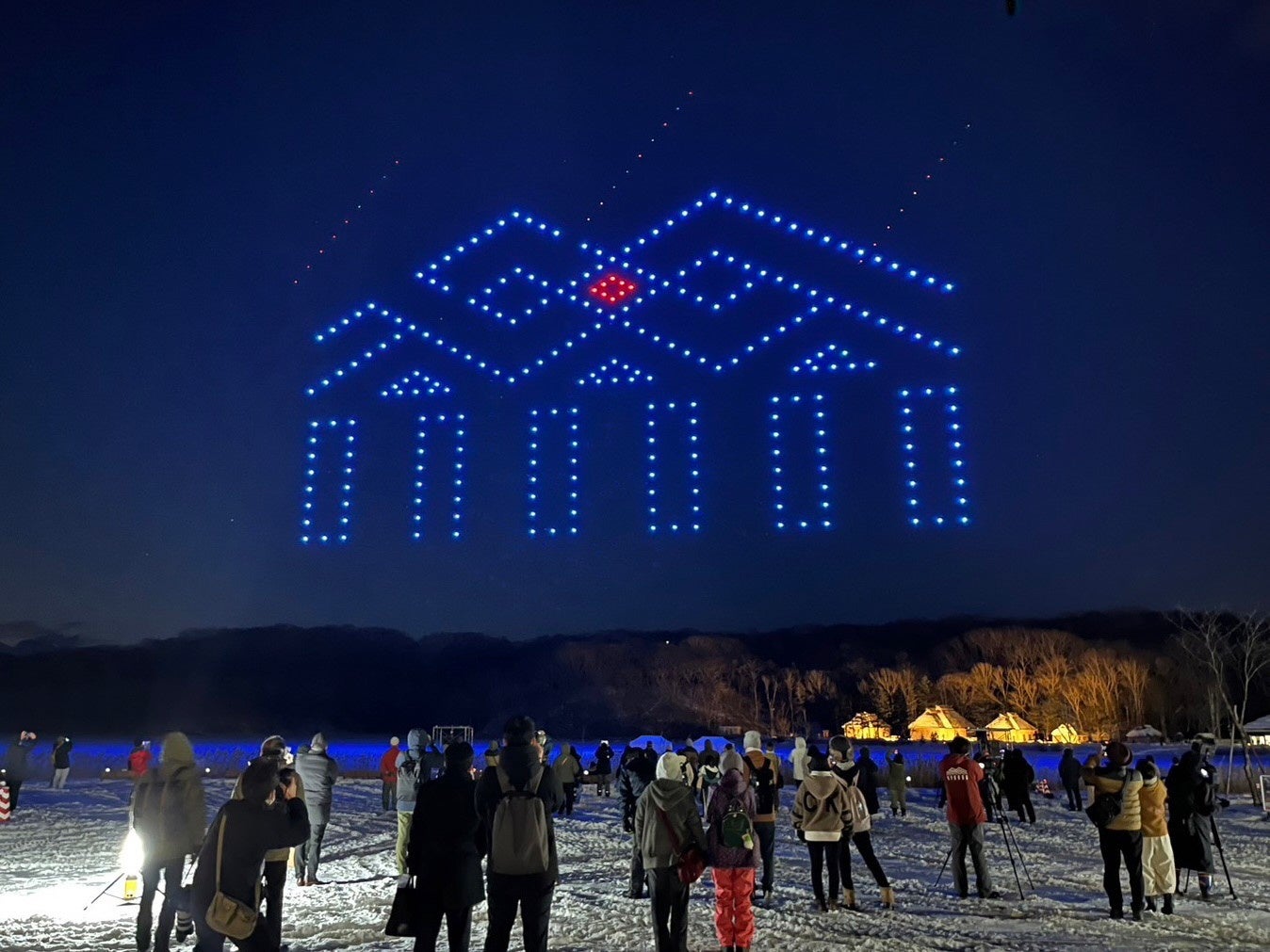 北海道白老町のウポポイ(民族共生象徴空間)にてドローンショーは初めての開催です。連日「アイヌ語のあいさつ」や「ウポポイPRキャラクター トゥレッポん」「シマフクロウ」などのウポポイやアイヌ文化に因んだオリジナルアニメーションがウポポイの夜空を暖かく彩りました。