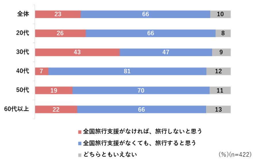 年代別でみると、30代では「全国旅行支援がなければ旅行しないと思う」が他の年代よりも高く、43%となった。