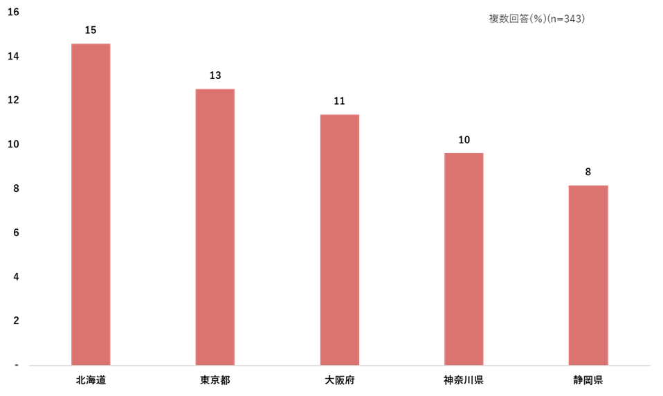 全国旅行支援を利用した旅行先は、「北海道」が15%でトップだった。次いで「東京都」(13%)、「大阪府」(11%)が続いた。